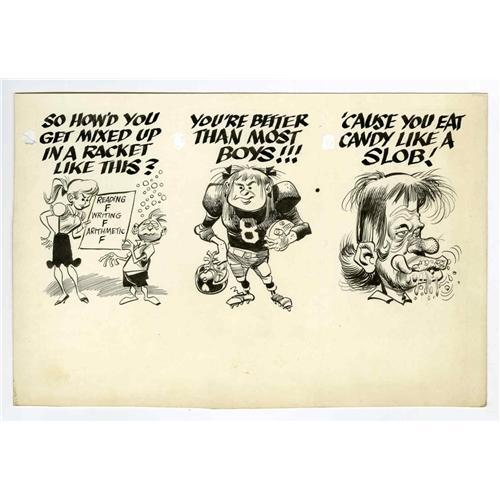 <B>Jack Davis - Funny Valentine Trading Card Illustrations Original Art (Topps, 1959-61).</B></I> Jack Davis' humor was perfect for humorous card messages such as these. These three illustrations were for the <B>Funny Valentines</B></I> series of trading cards produced by Topps. This piece has a combined image area of 5" x 10.5", and the art is in Excellent condition.