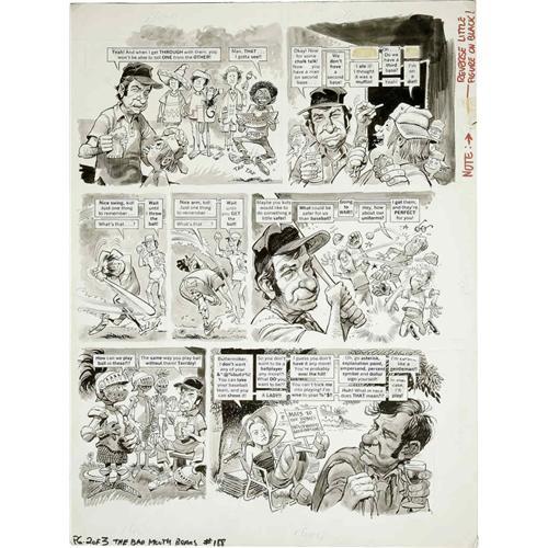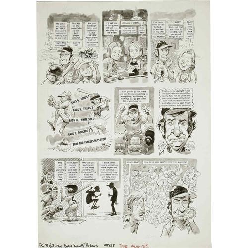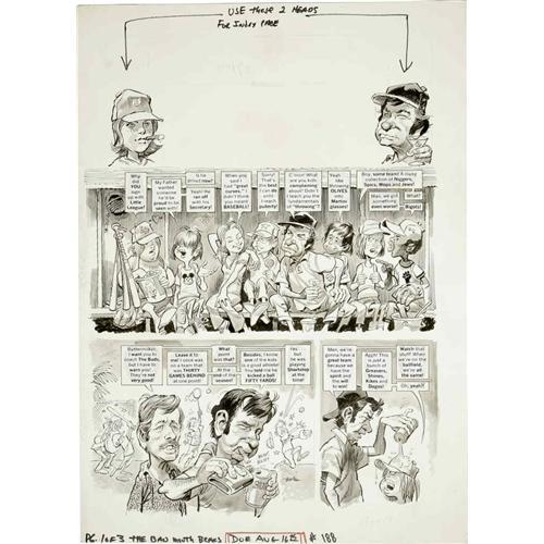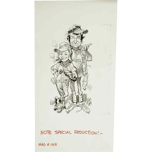 <B>Jack Davis - Mad #188 Complete 3-page Story "The Bad Mouth Bears" Original Art (EC, 1977).</B></I> Jack Davis skewers "The Bad News Bears" with his incisive line and rapier-like wit! Outstanding caricatures of Walter Matthau and Tatum O'Neal are featured throughout this lampoon. In addition to the three-page story, this lot also includes a large portrait of Matthau and O'Neal. Each story page has an image area of 16" x 22", while the portrait panel has an image area of 6.5" x 14". All of the art is in Excellent condition. <I>From the Mad Magazine Archives</B></I>.