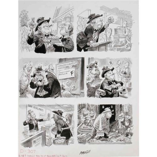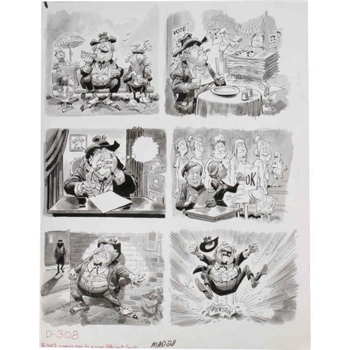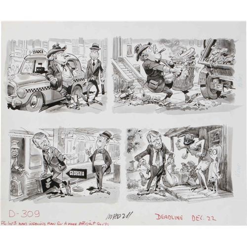 <B>Jack Davis - Mad #211 Complete 3-page Story "Mad's Ingenious Plan For A More Efficient Government" Original Art (EC, 1979).</B></I> Jack Davis illustrates <B>Mad's</B></I> hysterical plans for several "draconian cuts" to big government. Vote for Alfred! The first page has an image area of 17" x 12", while the last two have image areas that measure 17.5" x 22". The art is in Excellent condition. <I>From the Mad Magazine Archives</B></I>.