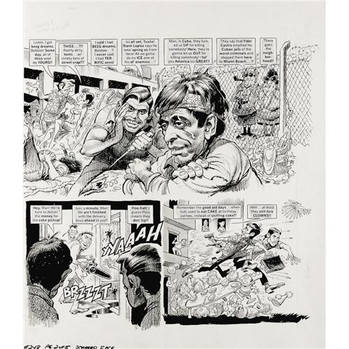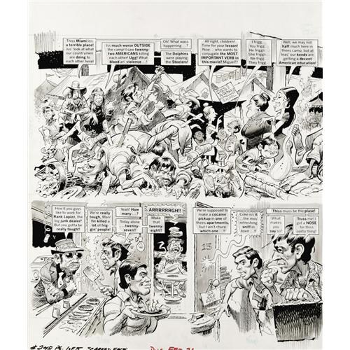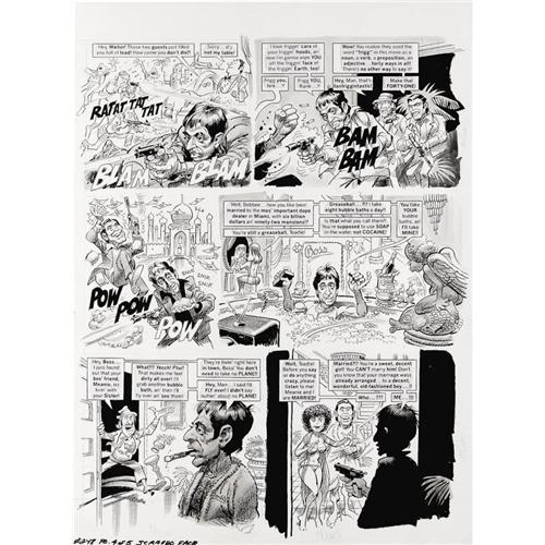 <B>Jack Davis - Mad #248, Complete 5-page Story "Scarred Face" Original Art (EC, 1984).</B></I> Jack Davis illustrates the five page motion picture satire, "Scarred Face," in ink, ink wash, and crayon. The image area of each page is approximately 16" x 18". In Excellent condition. <I>From the Mad Magazine Archives</B></I>. <BR><BR><B>Important notice:</B> Heritage usually auctions material at the rate of 200-250 lots per hour. On some occasions eBay Live bid software or the Internet may not be able to keep up with the pace of the auction. We recommend placing a realistic absentee bid now as insurance to avoid disappointment. Occasionally the auctioneer may eliminate or reject an eBay Live bid, and the auctioneer may also reopen a lot after the close of the eBay live bidding (usually because we missed an audience bid), and may reject your bid even if it shows you as the winning bidder. By bidding via eBay Live, you agree that Heritage may award the lot to another bidder at its sole discretion under the circumstances described above or any other reasonable circumstances. Since eBay bids are not shown to us until we open the lot on the floor, we treat those bids just like floor bids. In most cases the floor responds before the eBay bid is presented to us, due to Internet lag time, so for consistency we have made it a policy that floor bids are always considered first over tie eBay live bids. Also please note that all Heritage lots purchased through eBay Live carry a 22.5% Buyer's Premium. Please make sure you read the Terms and Conditions before you bid. This lot is being auctioned in conjunction with a live floor auction by Heritage Auction Galleries. All final auction and invoice information will be supplied by Heritage Auction Galleries, and all other information should be considered preliminary. Lot:41001 <BR><BR><B>Winning Notification and Billing:</B> After the FINAL session in this auction is complete, Heritage will send e-mail and snail mail invoices. This process normally takes several days. All final auction and invoice information will be supplied by Heritage Auction Galleries, and all other information should be considered preliminary. <BR><BR>This auction will be conducted on a live auction floor and over the Internet through eBay Live. If you choose to place an absentee bid, please take a moment to <font color='#0000ff'><u><a href='http://pages.ebay.com/liveauctions/help/before/laabsentee.html'>learn how eBay Live absentee bidding works</a></u></font><font color='#000000'>