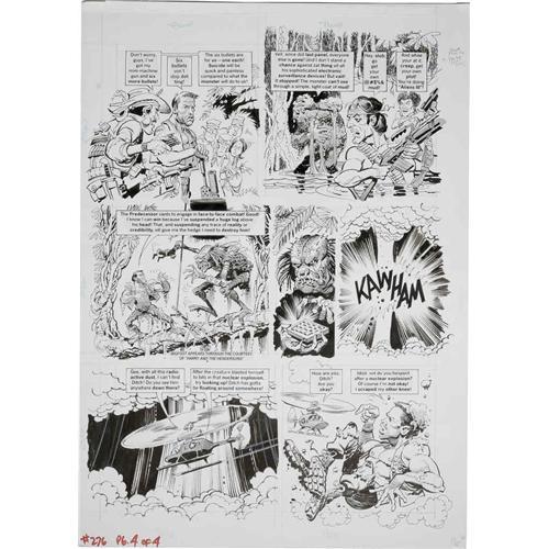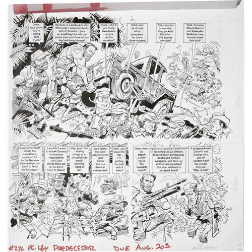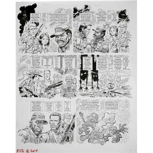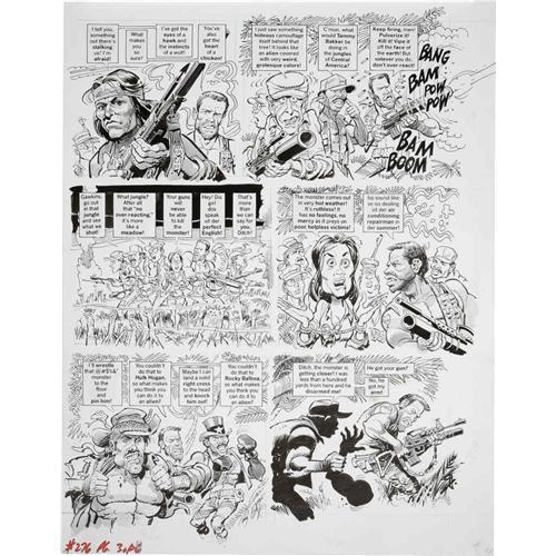 <B>Jack Davis - Mad #276 Complete 4-page Story "Predecessor" Original Art (EC, 1988).</B></I> Arnold Schwarzenegger and "Predator" prove to be easy targets for Jack Davis -- with his wicked wit, the <B>Mad</B></I> parodies never miss! We'd "Ventura" guess that you'll love this as much as we do. The first page of this story has an image area of 17" x 17", and the rest of the pages have image areas of 16" x 21.5". Also included in the lot are the vellum overlays, with red marker, indicating to the printer where to drop in greytones. The art is in Excellent condition. <I>From the Mad Magazine Archives</B></I>.
