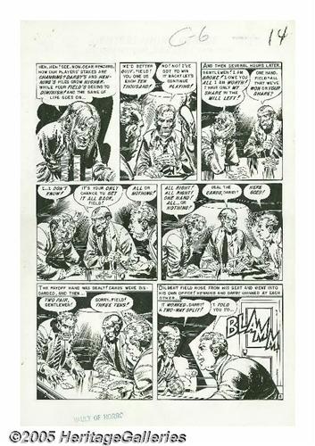 <B>Jack Davis - Vault of Horror #28, page 6 Original Art (EC, 1952).</B></I> The Crypt-Keeper narrates the play-by-play chicanery of two card cheats in this smoke-filled scene from the spine-tingling yarn, "The Chips Are Down." Jack Davis' mastery of dramatic lighting backed with his talent for expressive figure drawing raises the tension of the high-stakes hand to a nearly unbearable level -- you can bet the grisly retribution ahead will prove to be a welcome release! The image area of the page measures 12" x 18", and the art is in Excellent condition. Any EC art collector would be thrilled to add a portrait of the Crypt-Keeper penned by Jack Davis to his stash -- so don't leave anything to chance, EC fan-addicts, bid today!