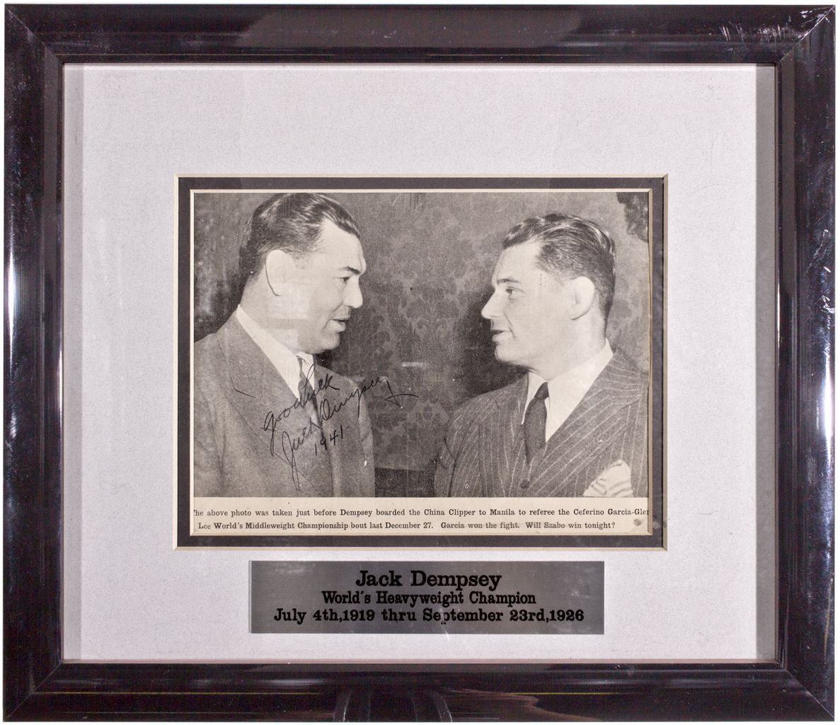 Framed photo of the World's heavyweight champ, taken before he boarded the plane to Manilla to referee a championship fight. It has Dempsey's signature on his picture, dated 1941. Plaque on matte commerates Dempsey's reign. Measures 14"x12". -60629