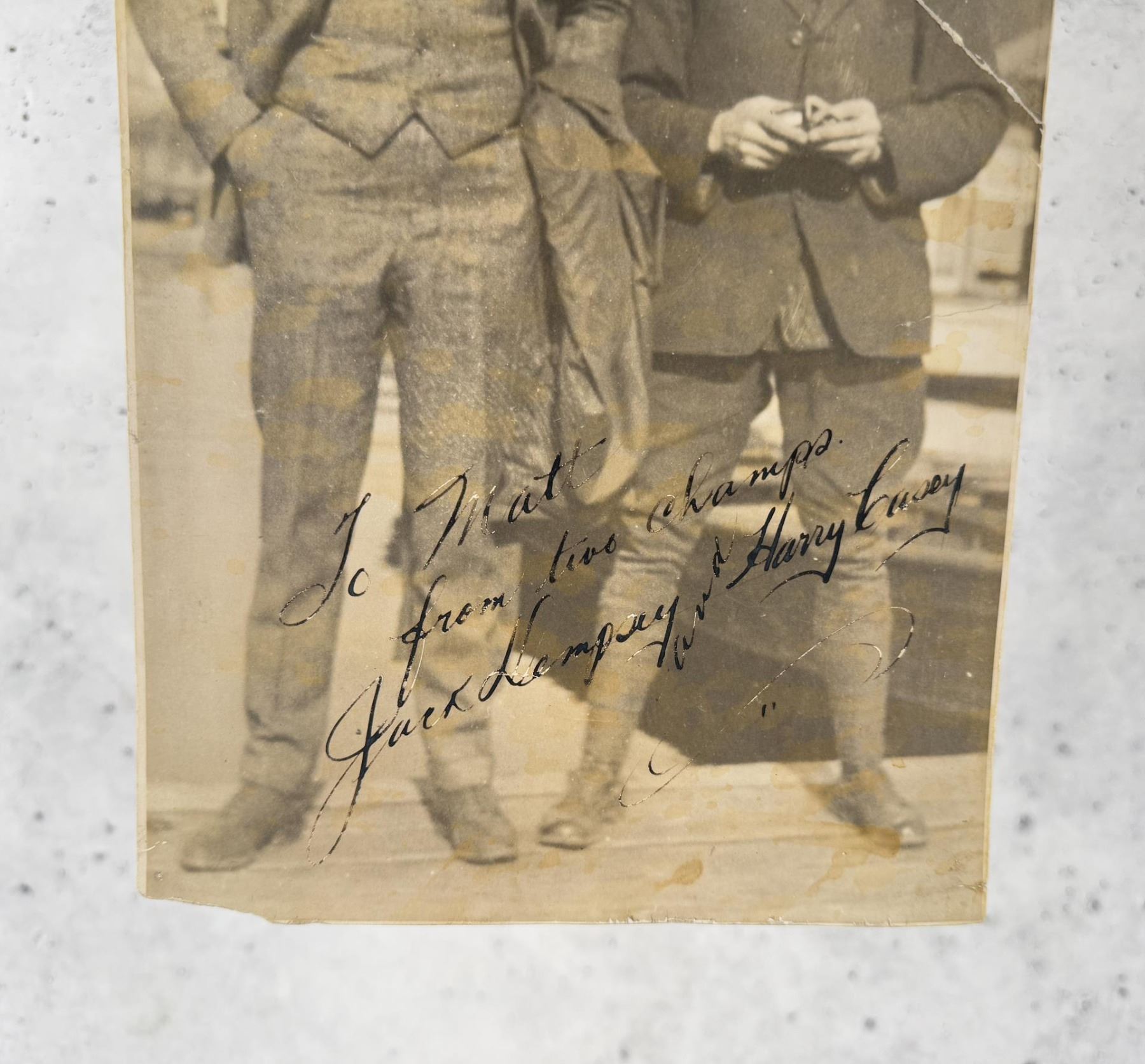 6 1/2" by 10 1/2" William Harrison "Jack" Dempsey (June 24, 1895 – May 31, 1983), nicknamed Kid Blackie and The Manassa Mauler, was an American boxer who competed from 1914 to 1927, and world heavyweight champion from 1919 to 1926. One of the most iconic athletes of his era, Dempsey is ranked sixth on The Ring magazine's list of all-time heavyweights and fourth among its Top 100 Greatest Punchers, while in 1950 the Associated Press voted him as the greatest fighter of the past 50 years. He is a member of the International Boxing Hall of Fame, and was in the previous Boxing Hall of Fame.