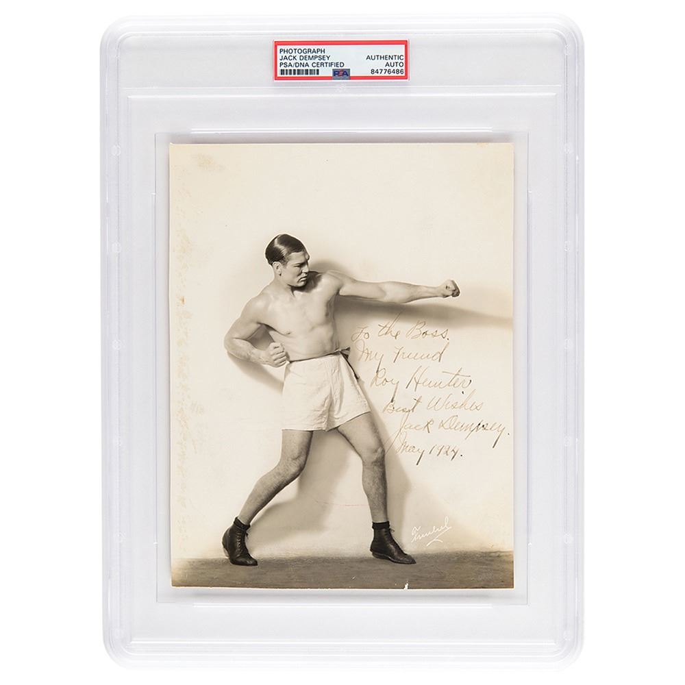 Striking vintage matte-finish 7 x 9 photo of Dempsey in a full-length boxing pose with an outstretched fist, signed and inscribed in fountain pen, "To the Boss, my friend, Roy Hunter, Best wishes, Jack Dempsey, May 1924.& rdquo; In fine condition, with lightly trimmed edges, and light staining along the left edge. Encapsulated in a PSA/DNA authentication holder.
