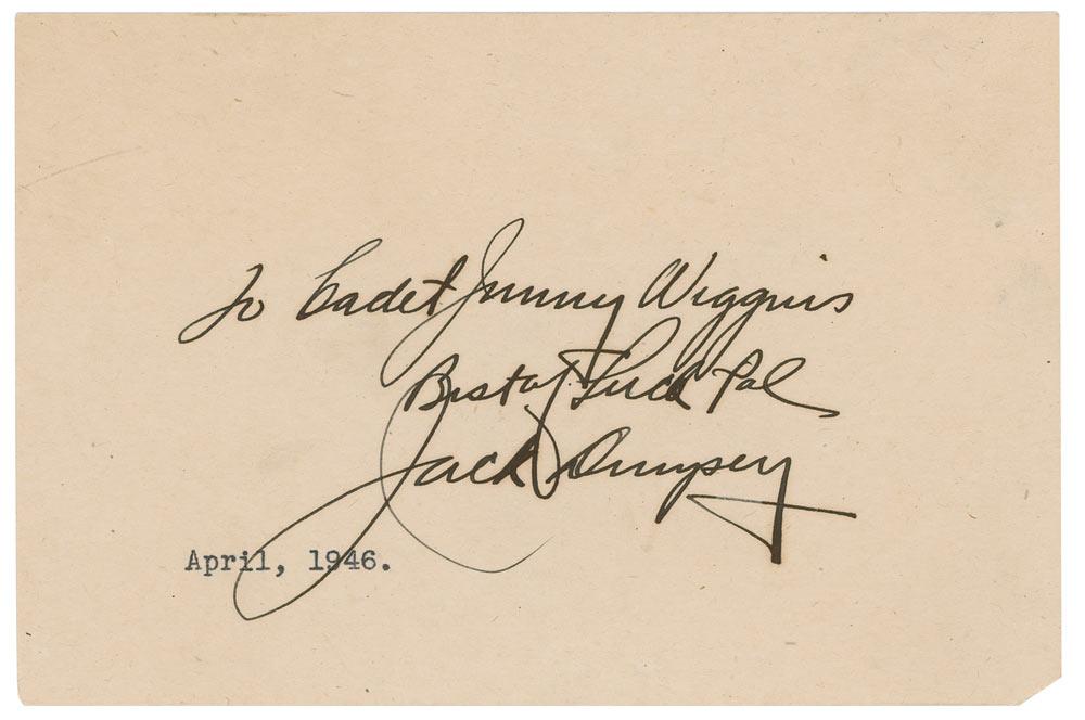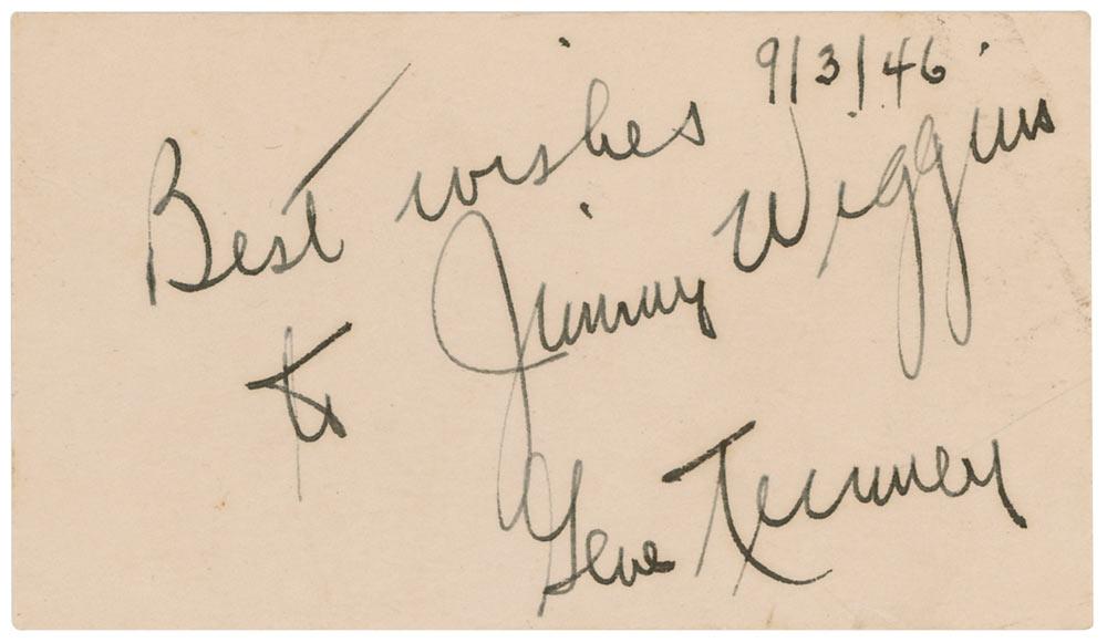 Vintage fountain pen signature and inscription, “To Cadet Jimmy Wiggins, Best of luck pal, Jack Dempsey,” on an off-white 6 x 4 card; and a vintage ink signature and inscription, “Best wishes to Jimmy Wiggins, Gene Tunney 9/3/46,” on an off-white 3.5 x 2 card. In fine condition, with some scattered light soiling to both, and a missing corner tip to Dempsey’s card.