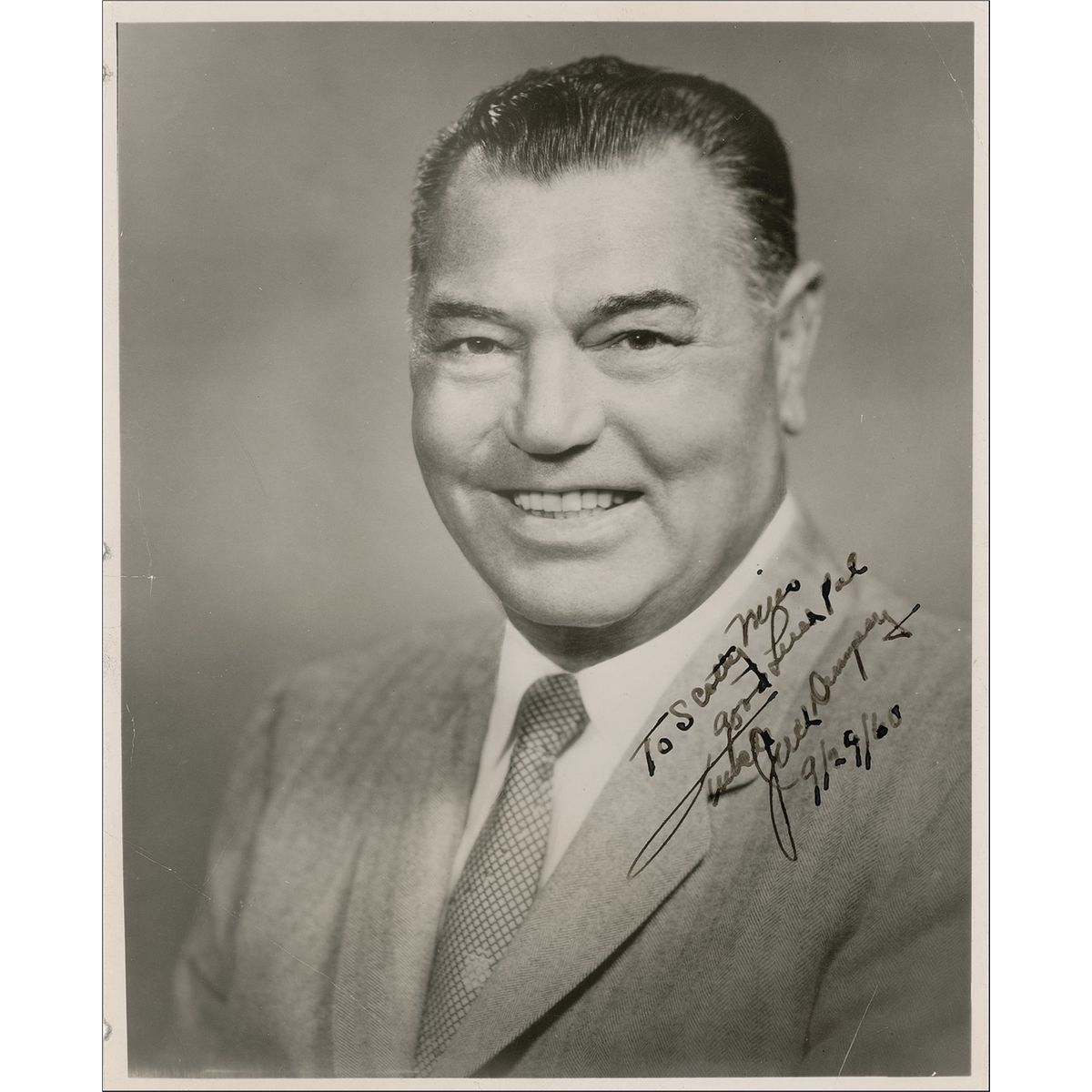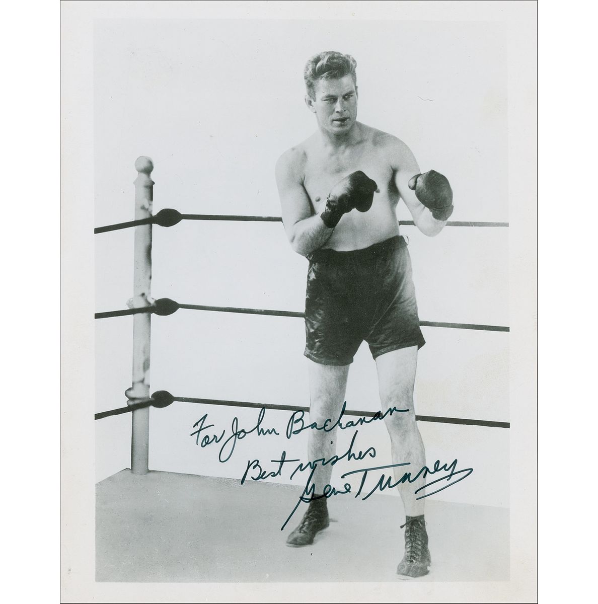 Vintage glossy 8 x 10 photo of Jack Dempsey in a jacket and tie, signed and inscribed in fountain pen, “To Scotty Mieo, good luck pal, Jack Dempsey 9/29/60”; and a glossy 8 x 10 photo of Gene Tunney in his prime, signed and inscribed in black felt tip, “For John Bachanan, Best wishes, Gene Tunney.” In very good condition, with scattered creasing to Dempsey’s photo, and a few light creases to Tunney’s photo.