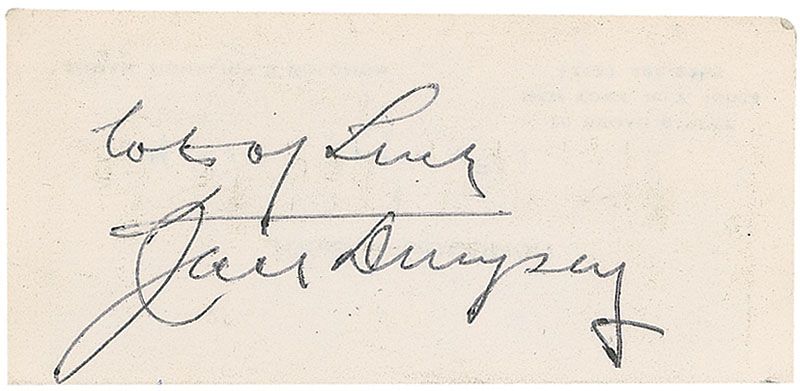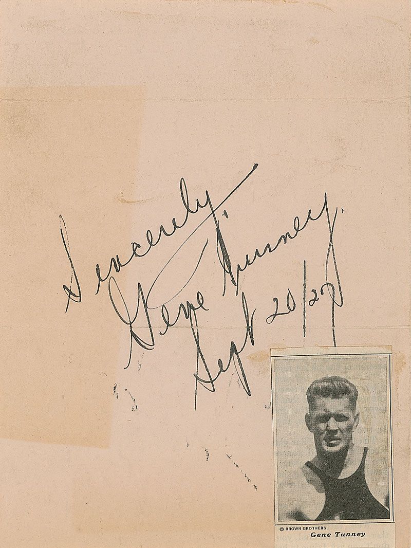 Two signatures: one ballpoint signature, “Lots of luck, Jack Dempsey,” on the reverse of a clipped 3.5 x 1.5 business card; and one vintage fountain pen signature, “Sincerely, Gene Tunney, Sept. 20/27,” on an off-white 5.5 x 7.25 sheet bearing an affixed