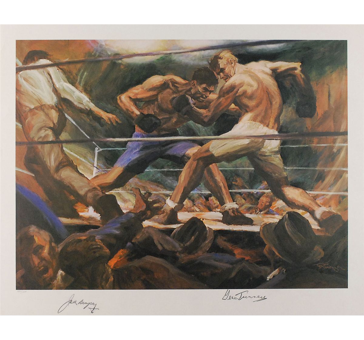 Difficult-to-find color limited edition 22 x 18 print, numbered 1346/1500, issued in the 1970s by Sports Illustrated, with a strongly stylized depiction of the two in the ring, signed by both Dempsey and Tunney in pencil in the white border beneath the image. In fine condition.