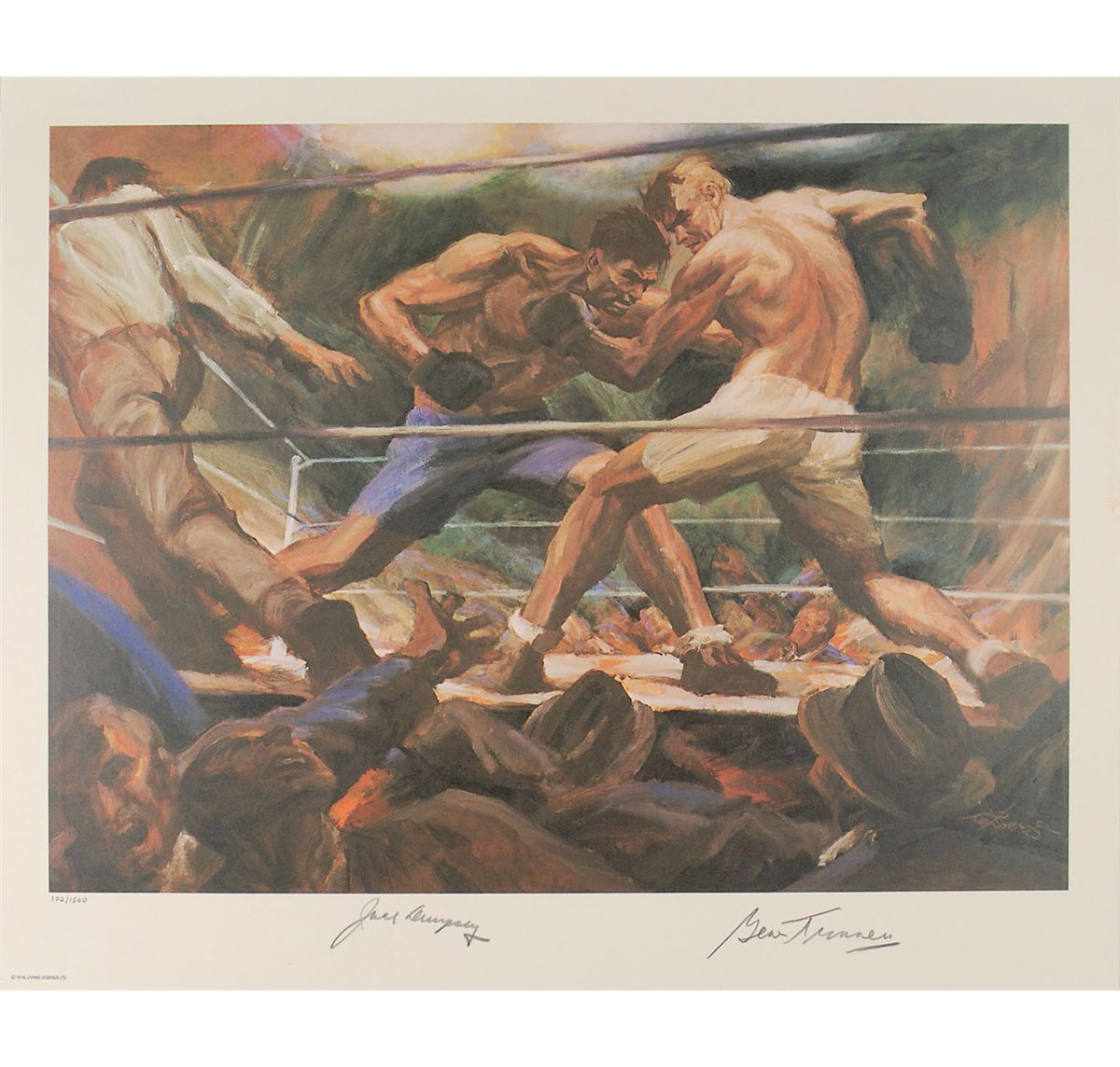 Color limited edition 22 x 18 print of a stylized depiction of Dempsey and Tunney in the ring, numbered 102/1500, signed in the lower border in pencil by both. In fine condition, with light dings and soiling to edges. These difficult-to-find prints were issued in the 1970s by Sports Illustrated.