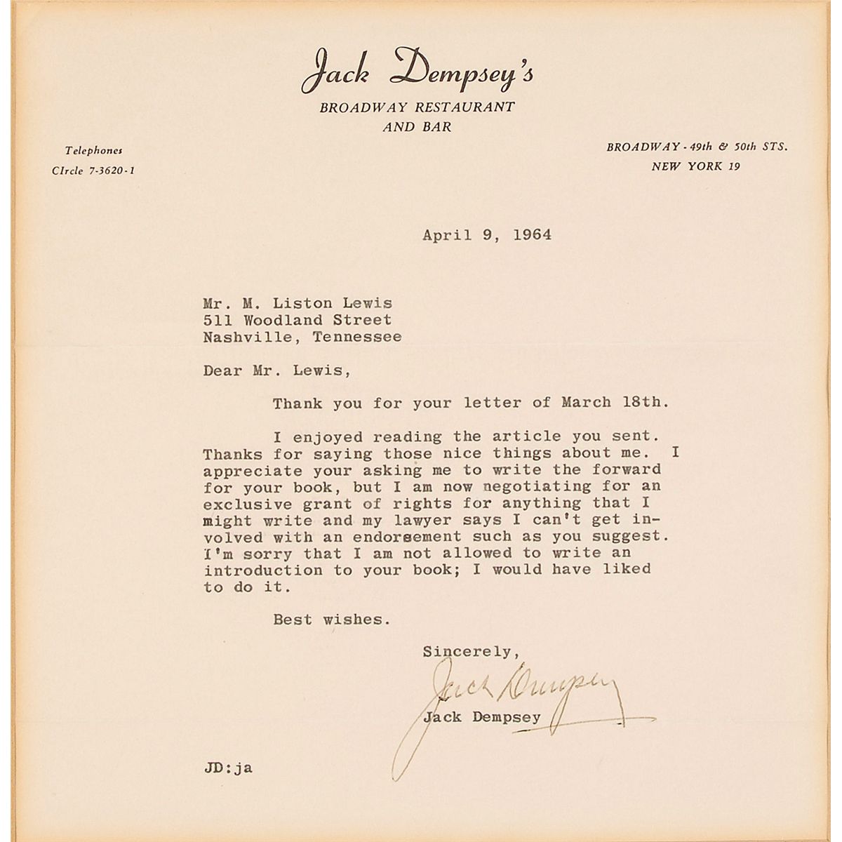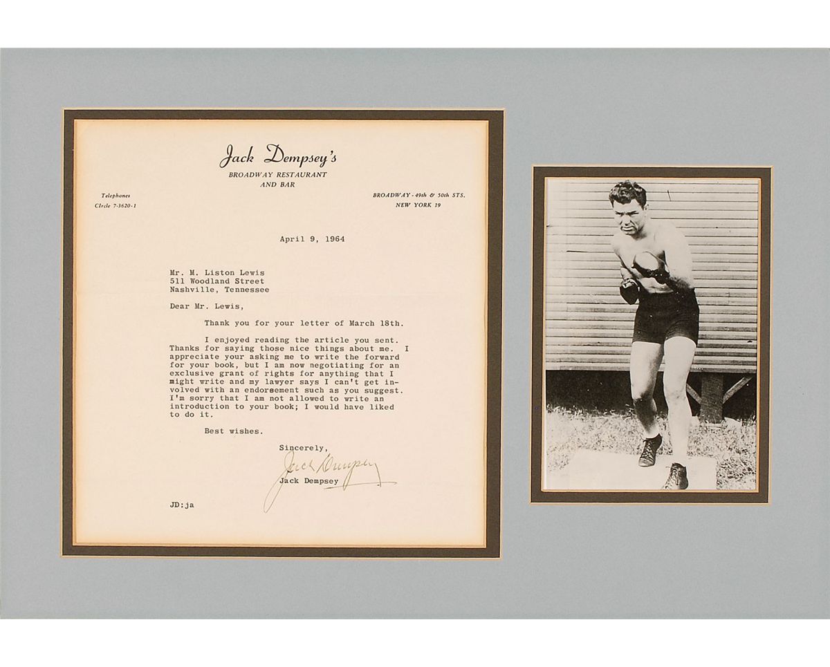 TLS, one page, 8.25 x 8.5, Jack Dempsey’s Broadway Restaurant and Bar letterhead, April 9, 1964. Dempsey writes to M. Liston Lewis in Nashville. In part: “I enjoyed reading the article you sent. Thanks for saying those nice things about me. I appreciate your asking me to write the forward for your book, but I am now negotiating for an exclusive grant of rights for anything I might write and my lawyer says I can’t get involved with an endorsement such as you suggest. I’m sorry that I am not allowed to write an introduction to your book; I would have liked to do it.” Double-matted with a photo of the champ to an overall size of 16.75 x 11.5. Uniform toning and a horizontal mailing fold across the bottom of the signature, otherwise fine condition. Accompanied by the original mailing envelope.