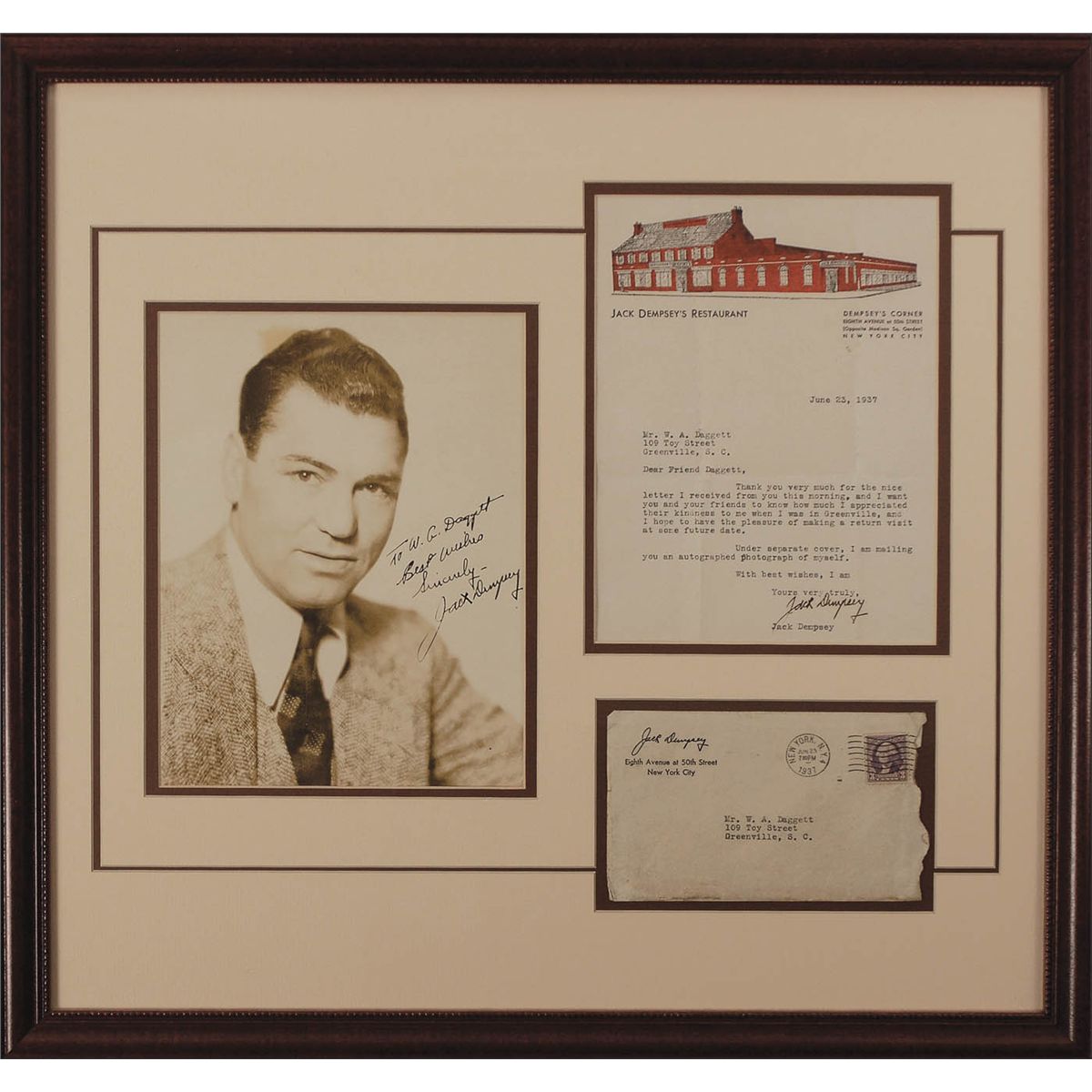 Two items: one vintage glossy 7 x 9 head-and-shoulders photo of Dempsey in a suit, signed and inscribed in fountain pen, “To W. A. Daggett, Best wishes, Sincerely, Jack Dempsey”; and one TLS, one page, illustrated Jack Dempsey’s Restaurant letterhead, June 23, 1937, thanking Daggett for his kindness during a trip to South Carolina. Nicely double matted and framed with the original mailing envelope to an overall size of 21 x 19.75. Scattered creases and an area of discoloration to the top of the photo, and intersecting folds to the letter with one passing through a single letter of the signature, otherwise fine condition.