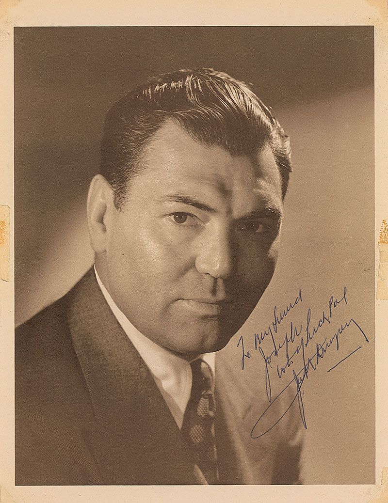 Vintage matte-finish 8 x 10 photo, signed and inscribed in blue ballpoint “To my friend Joseph, lots of luck Pal, Jack Dempsey.” Toning and tape remnants to borders and corners, all of which could be matted out, otherwise fine condition.