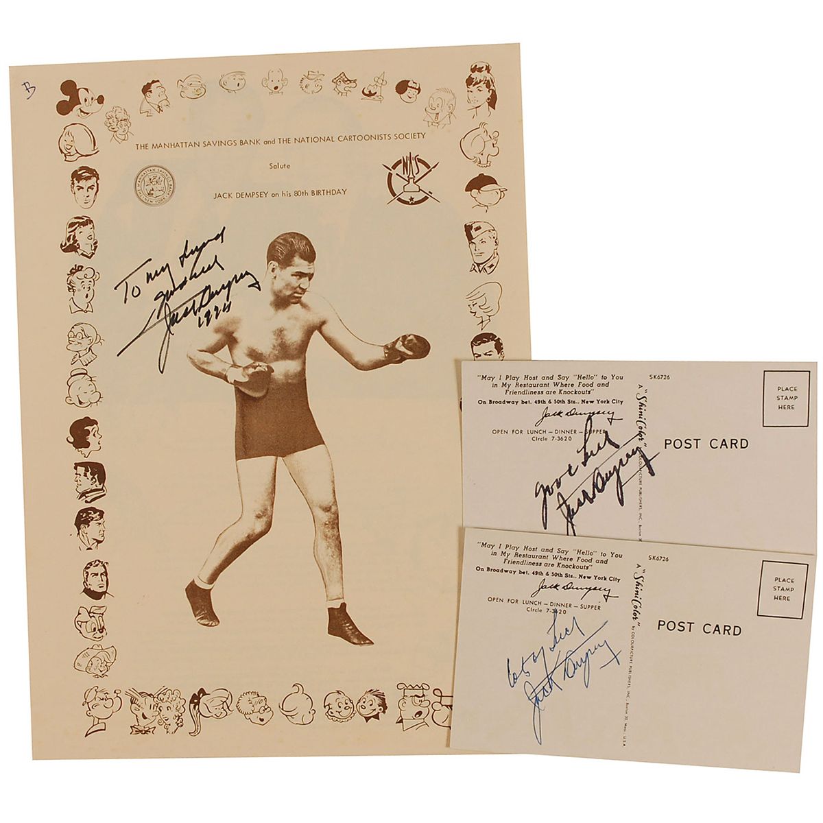 Three items: two 5.5 x 3.5 postcards featuring an illustration of Dempsey’s fight against Jess Willard, each signed on the reverse in blue or black ink; and one program celebrating Dempsey’s 80th birthday, signed in black felt tip. In overall fine condition.