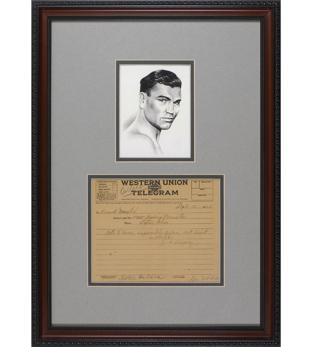Handwritten Western Union telegram, one page, 8 x 7, September 12, 1925. Dempsey sends a telegram to Dayton, Ohio, promoter Frank Mantel. In full: “Date too soon impossible before Oct. First.” Double-matted and framed with an image of Dempsey to an overall size of 16 x 22. A central vertical fold, uniform toning, and expected notations, otherwise fine condition. At this time, Dempsey had broken off ties with his longtime manager Jack Kearns, and was in the midst of trying to sign a fight with Harry Wills.