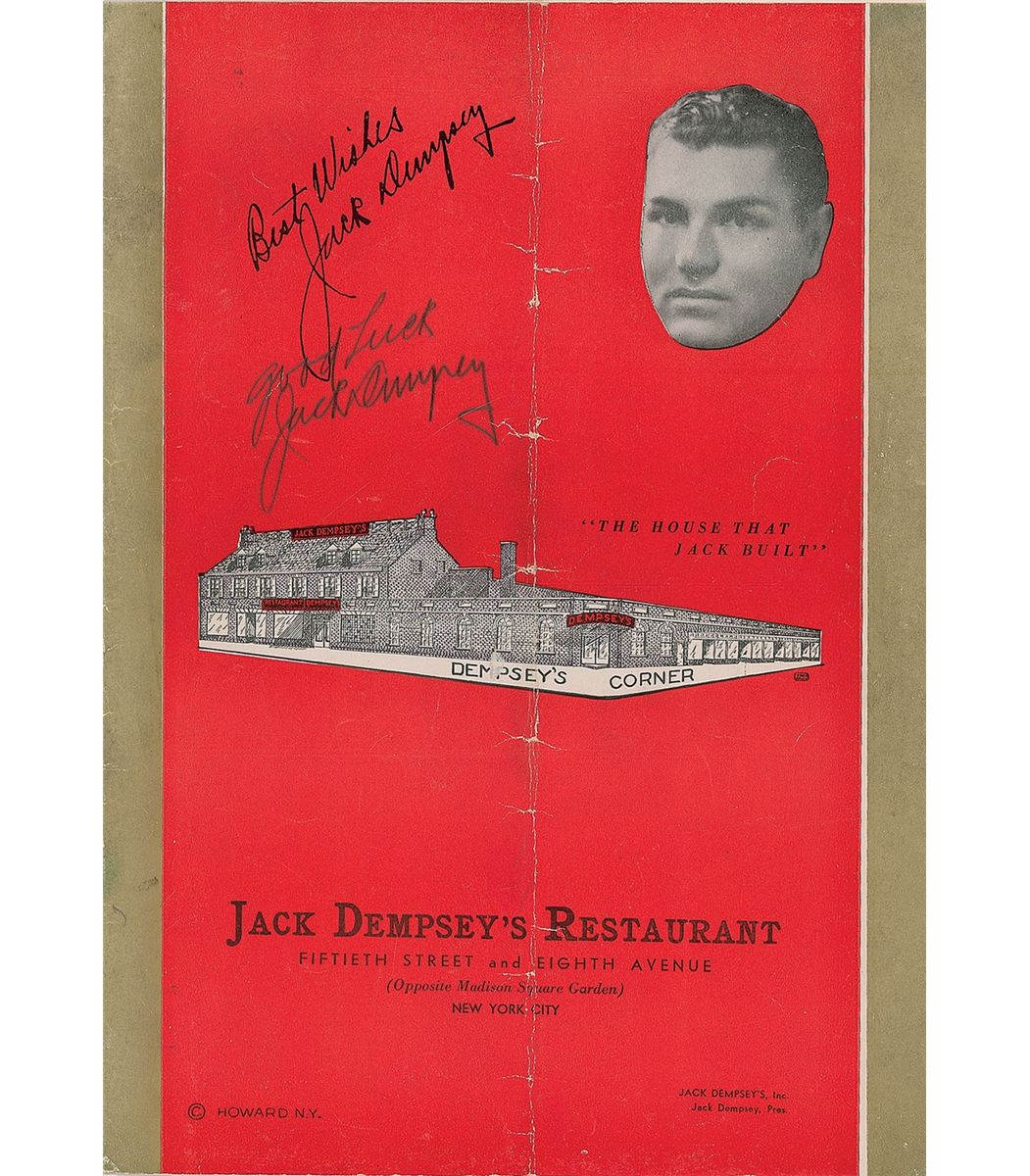 Menu for Jack Dempsey’s Restaurant in New York, 8.5 x 12, signed on the front cover in pencil, “Good Luck, Jack Dempsey.” Cover also bears a pre-printed signature of the boxer. In very good condition, with a significantly creased central vertical fold and some scattered staining.