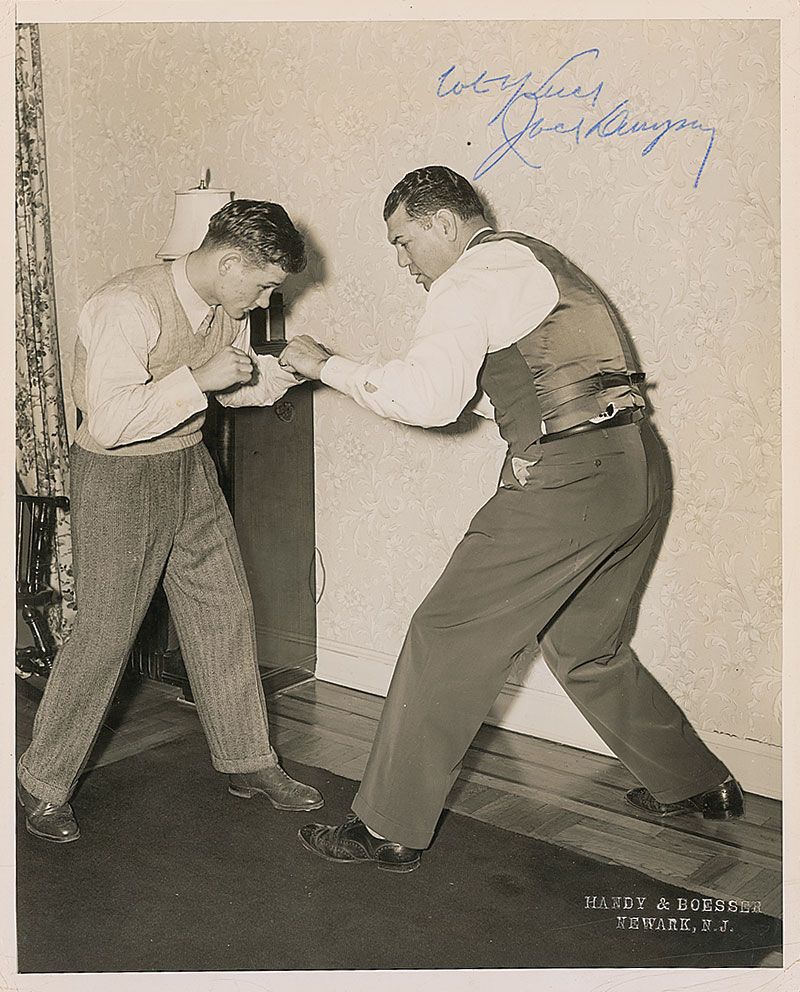 Glossy 8 x 10 photo of Dempsey giving some tips to another fighter, signed in blue ballpoint, “Lots of luck, Jack Dempsey.” In fine condition, with some scattered light creases, mainly to corners, and photographer’s stamp to lower right.