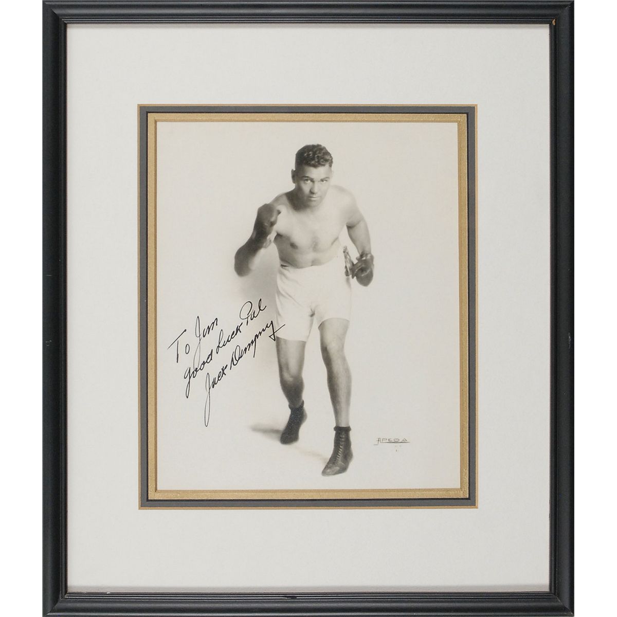 Choice vintage matte-finish 6.75 x 8.25 photo of Dempsey striking a pugilistic pose, boldly signed and inscribed against the white background in black ink, “To Jim, good luck Pal, Jack Dempsey.” Nicely triple-matted and framed to an overall size of 11.75 x 13.75. In fine condition.