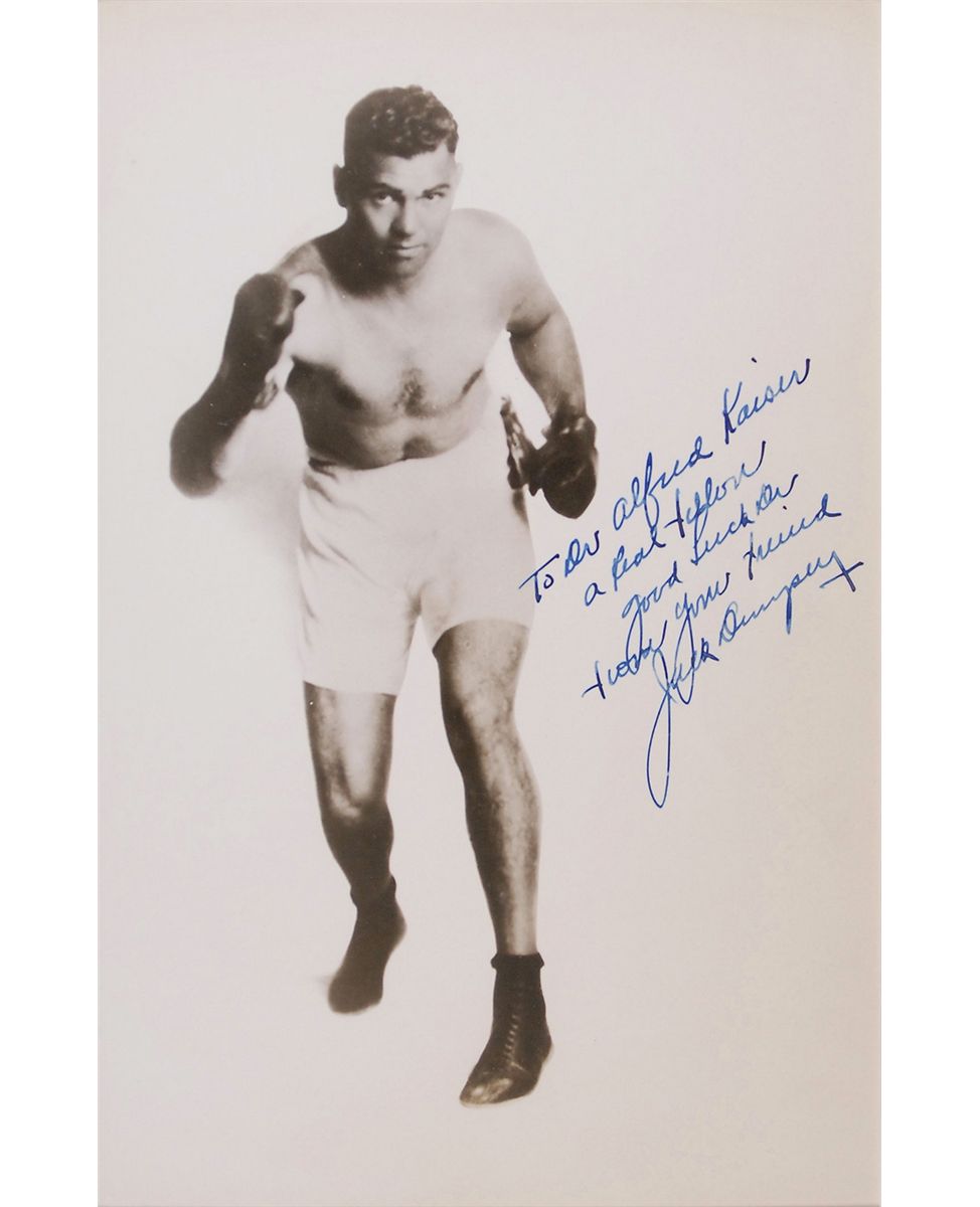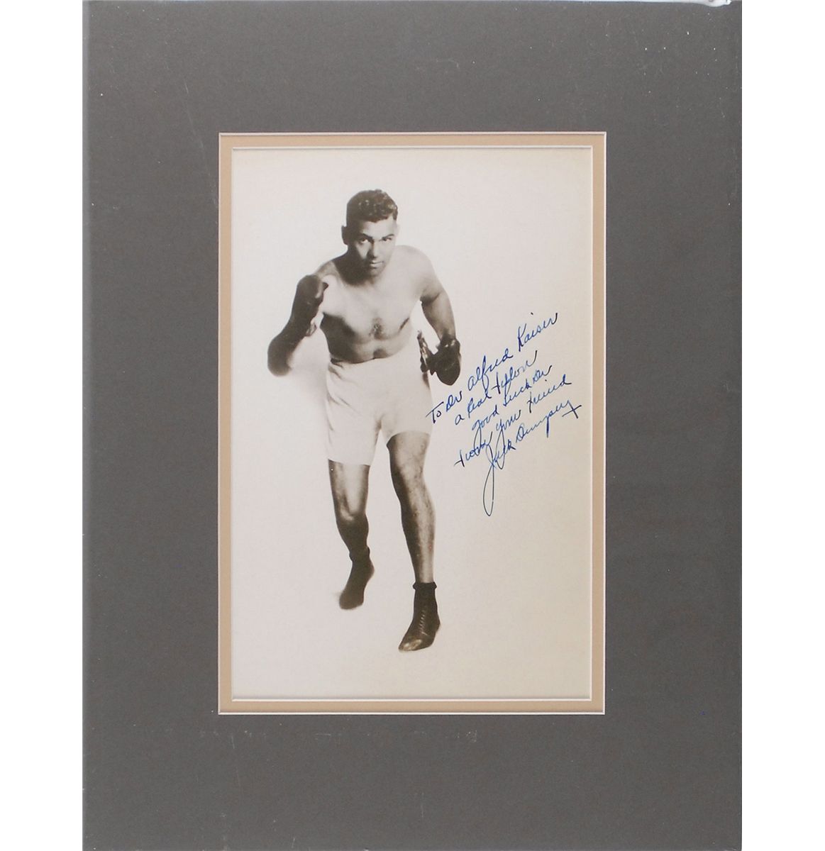 Vintage glossy 6.5 x 10 photo of Dempsey in a pugilistic pose, nicely signed and inscribed against the bright white background in fountain pen, “To Dr. Alfred Kaiser, a real fellow, good luck Dr., from your friend, Jack Dempsey.” Double-matted to an overall size of 12 x 15.5. In fine condition.
