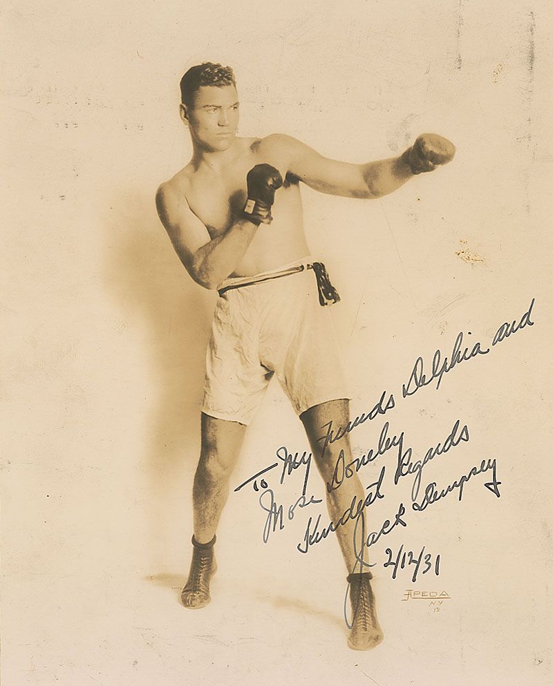 Vintage matte-finish 8 x 10 full-length photo of Dempsey throwing a left jab, signed and inscribed in fountain pen, “To my friends Dalphia and Mose Doneley, Kindest regards, Jack Dempsey 2/12/31.” Scattered soiling and surface marks and a small repaired tear to bottom edge, otherwise fine condition.