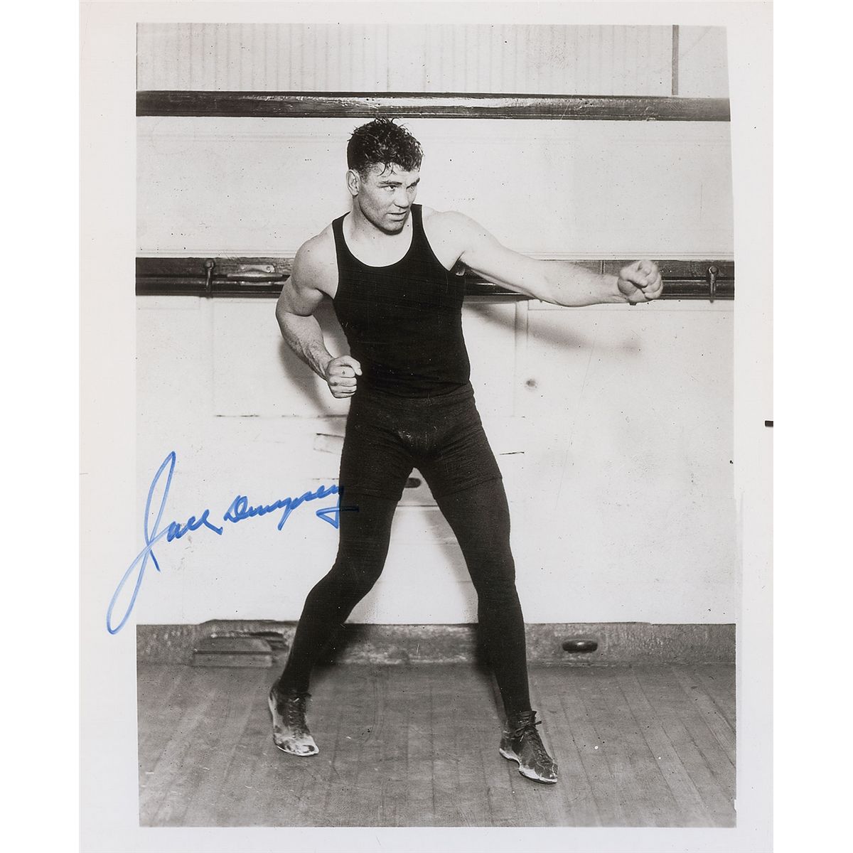 Glossy 8 x 10 photo of Dempsey throwing a punch, signed in blue felt tip. In fine condition, with a couple surface creases.