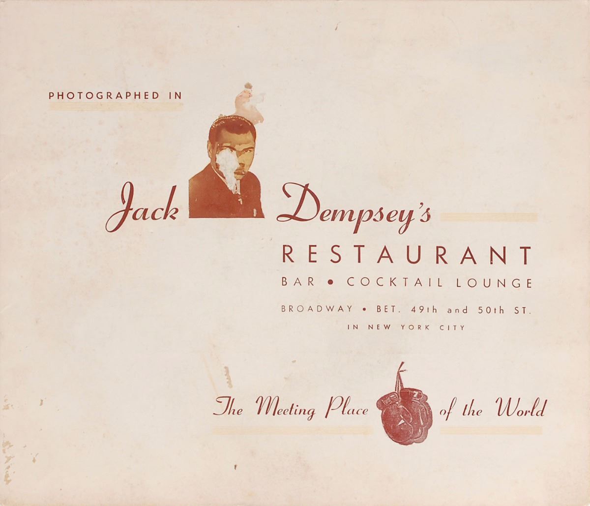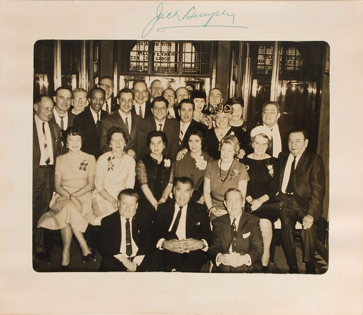 Vintage glossy 10 x 8 photo of Dempsey, front and center, seated and posing with a crowd of people in his restaurant, housed in its original 11 x 9.5 Jack Dempsey’s Restaurant presentation folder, signed inside on the mat border in green ballpoint by Dempsey. In fine condition. Accompanied by a period ringside ticket stub for bouts during the week of June 13–20.