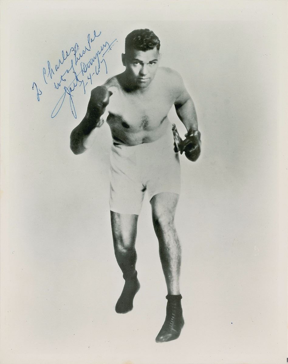 Glossy 8 x 10 photo of Dempsey in a pugilistic pose, signed and inscribed in blue ballpoint, “To Charles, lots of luck pal, Jack Dempsey, 7-4-67.” In fine condition.