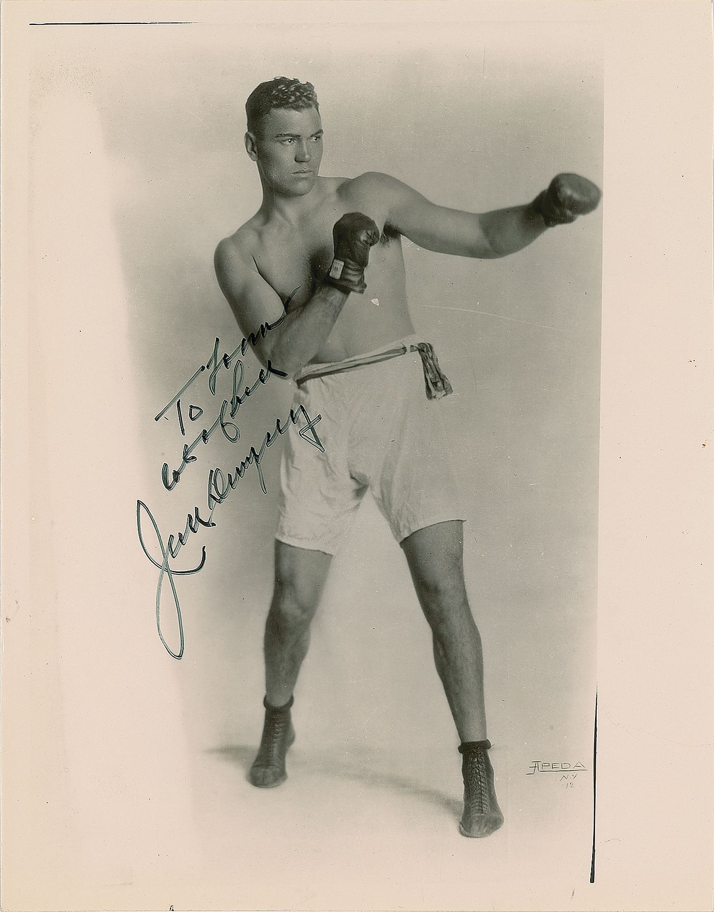 Glossy 7.75 x 10 photo of Dempsey striking a pugilistic pose, signed and inscribed in black felt tip, "To Joan, lots of luck, Jack Dempsey.” In fine condition, with a couple of light creases to the bottom.