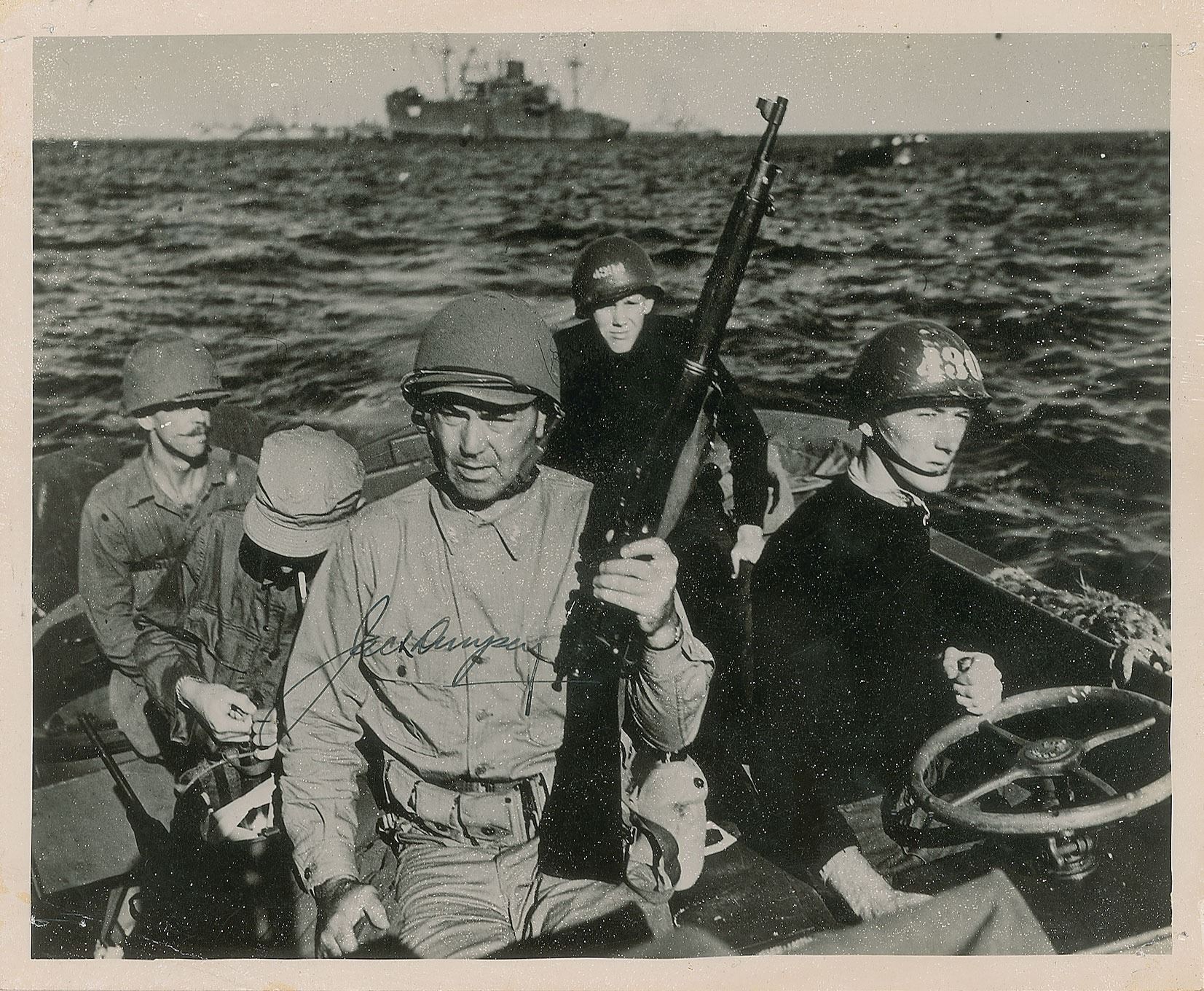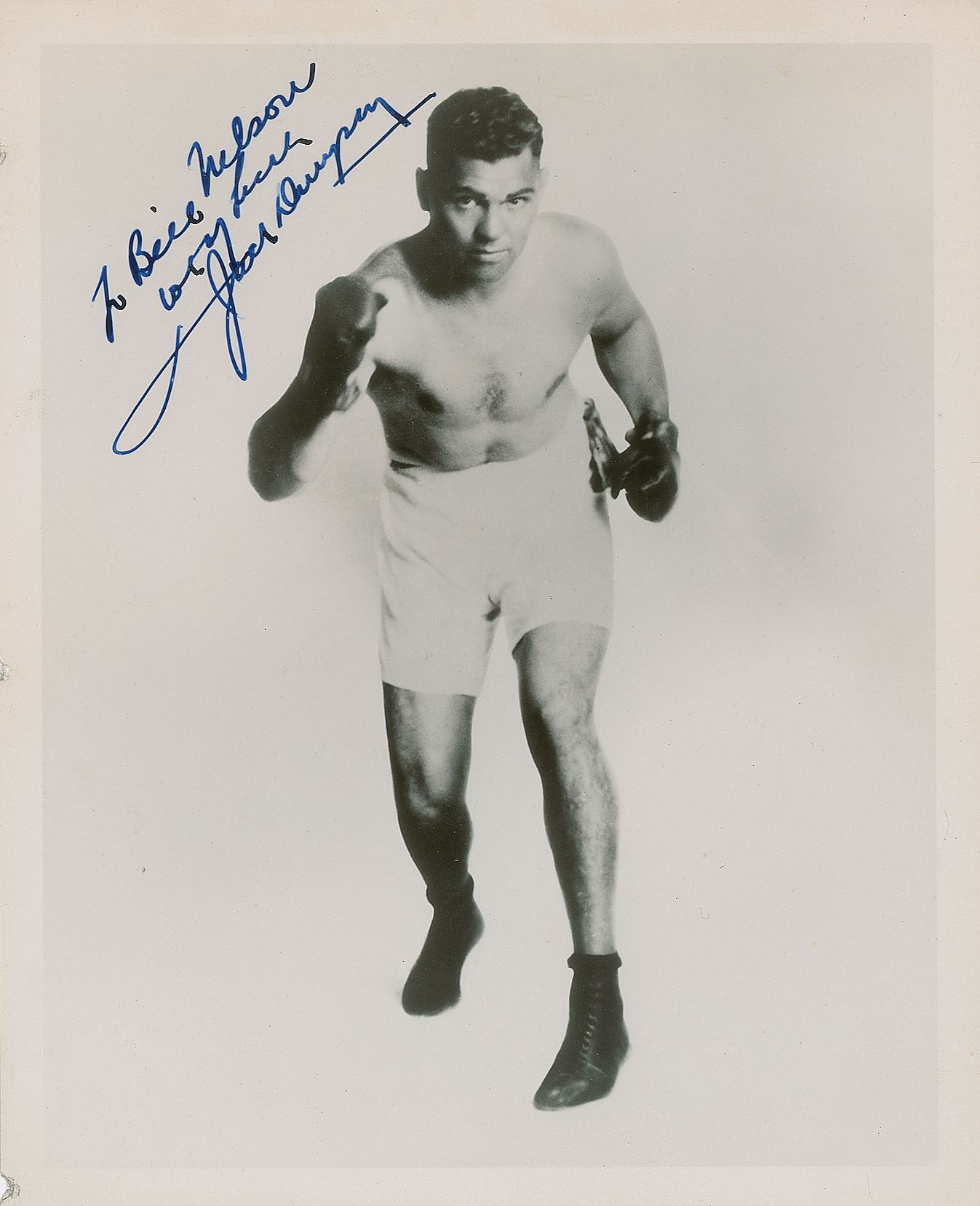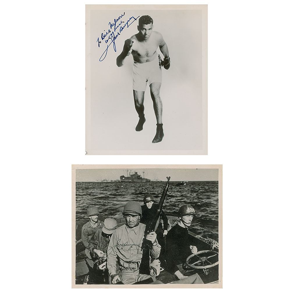 Two photos: a vintage glossy 8 x 10 photo of Dempsey in a full-length pugilistic pose, signed and inscribed in bold fountain pen, "To Bill Nelson, lots of luck, Jack Dempsey"; and a glossy vintage 10 x 8 of Dempsey at sea during World War II as an officer in the Coast Guard Reserve, signed in fountain pen, "Jack Dempsey." In overall very good to fine condition, with scattered light creasing, three binder dings to the left edge of the boxing photo, and several staple holes to the military photo.