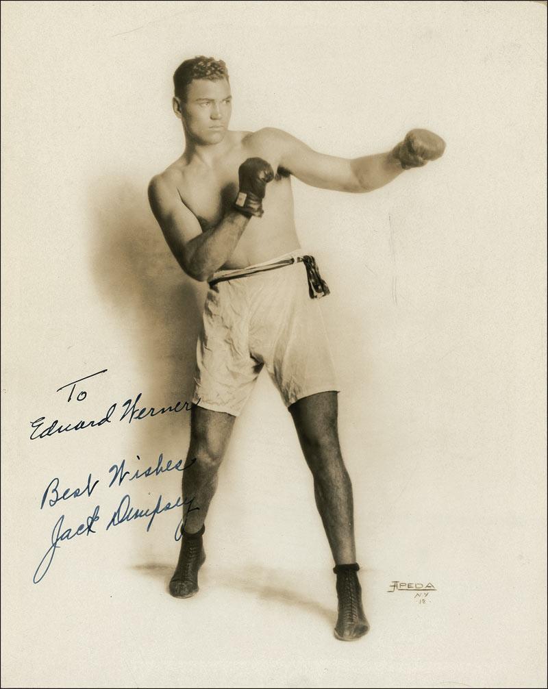 Boxer (1895-1983) who held the World Heavyweight title from 1919 to 1926. Vintage sepia glossy 8 x 10 photo of Dempsey striking a boxing pose, signed and inscribed in black fountain pen “To Eduard Werner, Best Wishes, Jack Dempsey.” In fine condition, with small crease at top corner.
