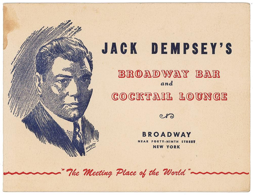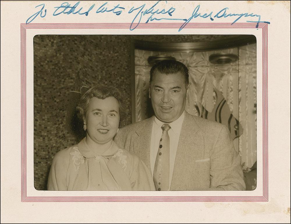 Vintage souvenir 8.5 x 6.5 fold-out presentation folder from Jack Dempsey’s Broadway Bar and Cocktail Lounge, containing a black-and-white glossy photo of Dempsey posing with a woman, signed and inscribed in blue fountain pen along the top edge of the holder, “To Ethel, lots of luck, Jack Dempsey.” In fine condition, with scattered soiling to the folder, and an edge stain on the front cover.