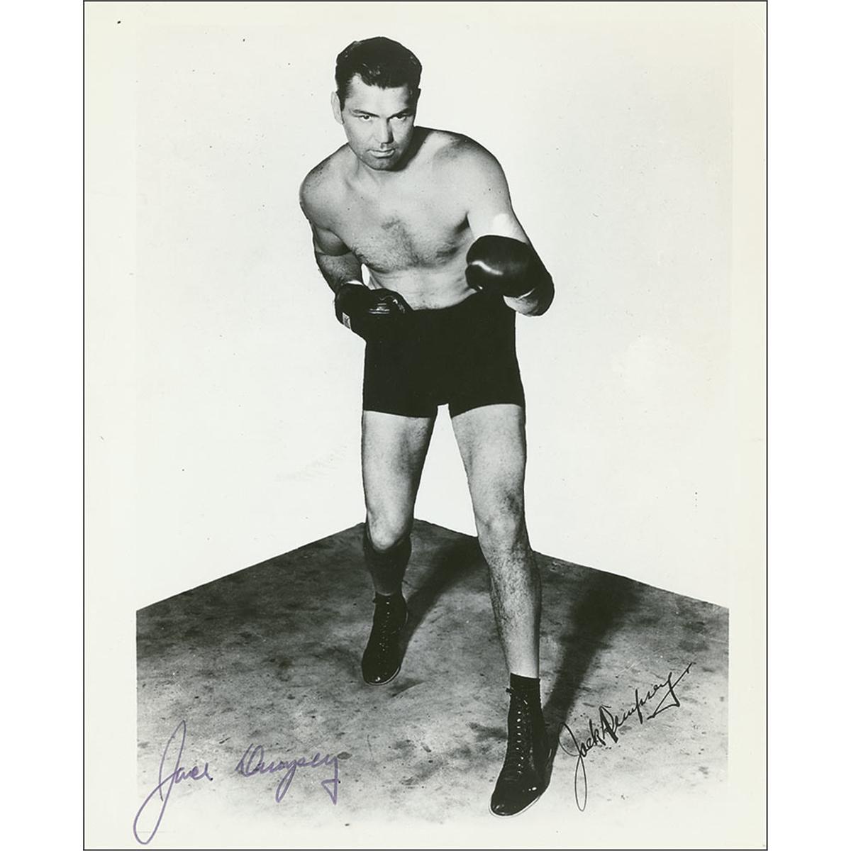 Glossy 8 x 10 photo of Dempsey in a boxing pose, signed in lightly faded black felt tip. In fine condition, with small corner creases, trivial surface impressions, and a pre-printed signature at the right corner.