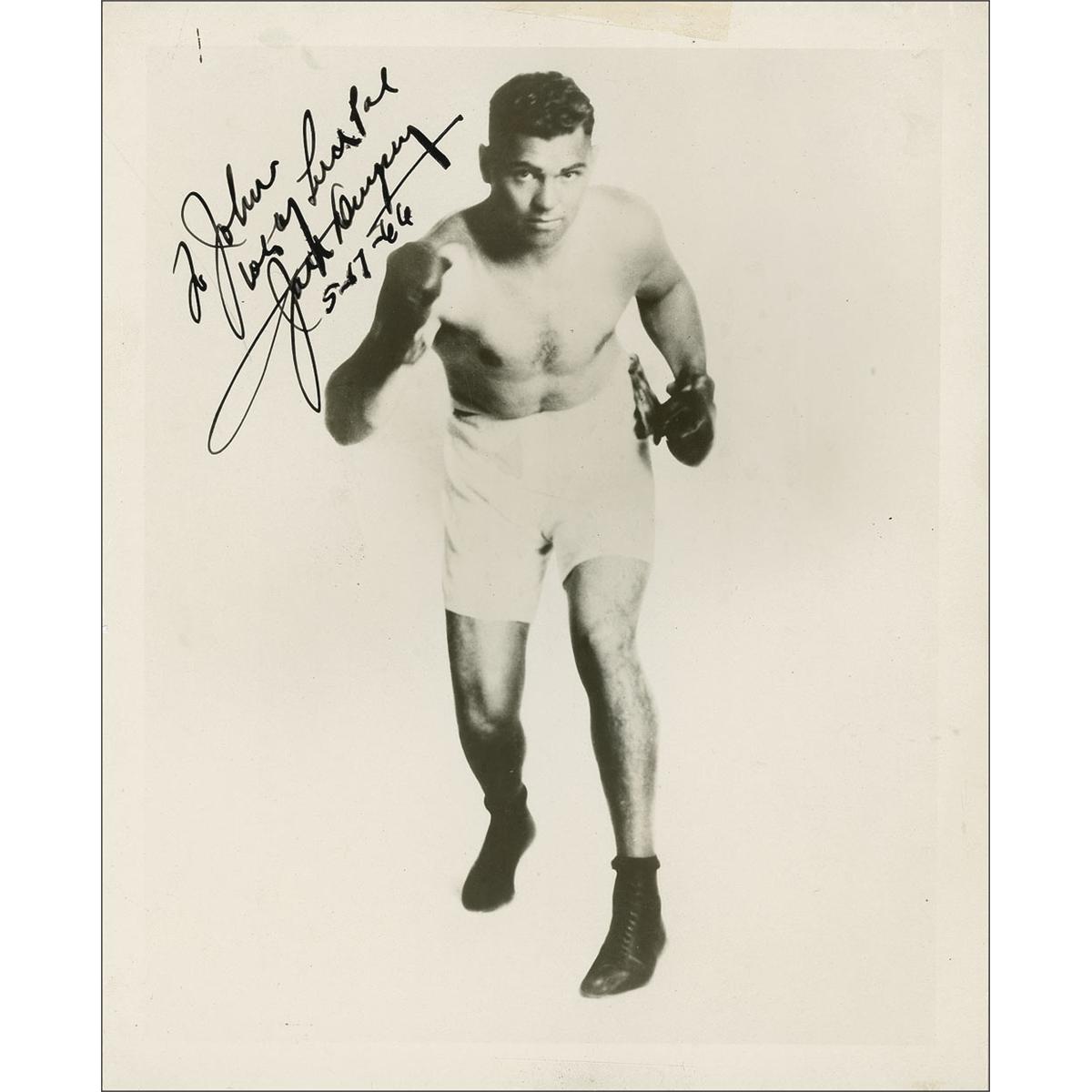 Two items: vintage glossy 8 x 10 portrait of Dempsey striking a boxing pose, signed and inscribed in fountain pen, “To John, Lots of Luck Pal, Jack Dempsey, 5-17-66”; and a blue fountain pen signature and inscription, “Lots of Luck, Jack Dempsey,” on a 3 x 1.75 slip. In overall fine condition, with a few scattered creases, some silvering to the dark areas, and small pieces of tape to the top and bottom borders of the photo.