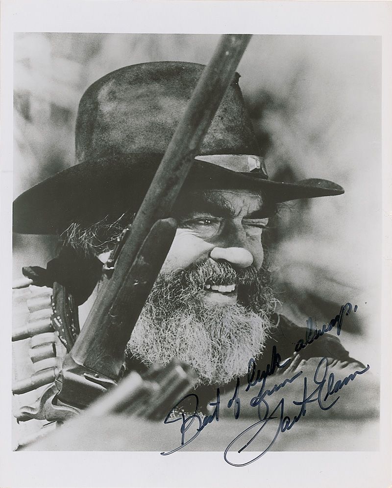 Glossy 8 x 10 photo of Elam in one of his many Western films, signed in black felt tip, “Best of luck always, Jack Elam.” Scattered surface creases and spotting to the finish, and two small tears to the right edge, otherwise fine condition.