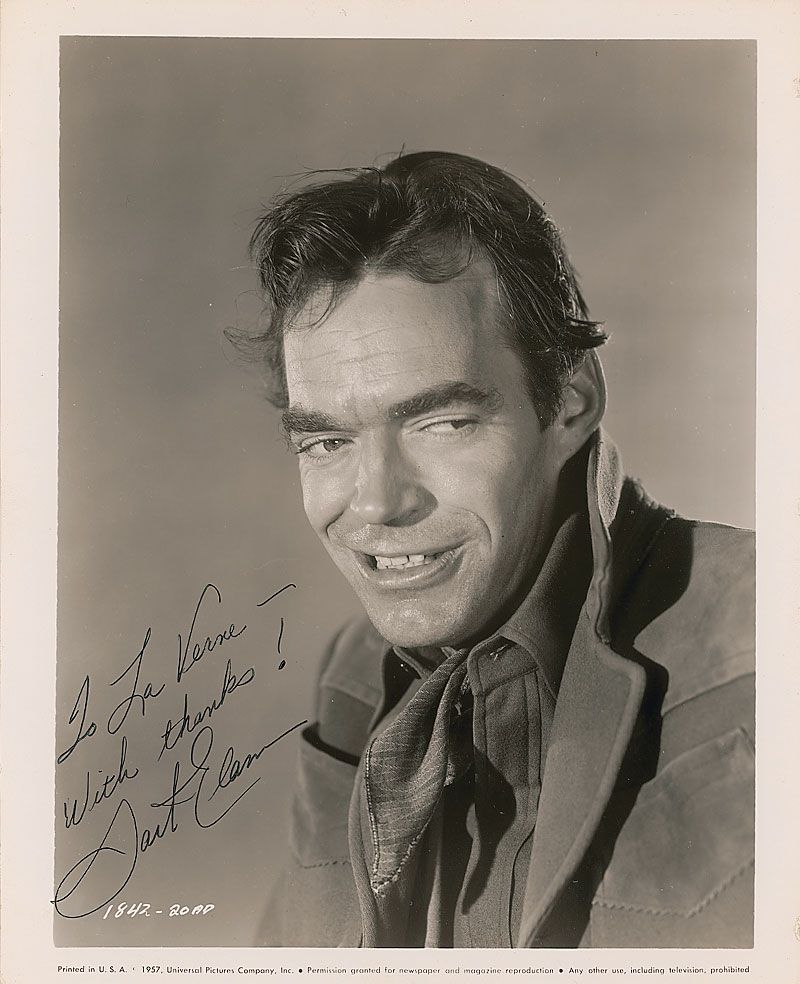 Glossy 8 x 10 Universal Pictures publicity photo, signed and inscribed in black ink, “To LaVerne—with thanks! Jack Elam.” In fine condition, with light binder dings to the right edge.