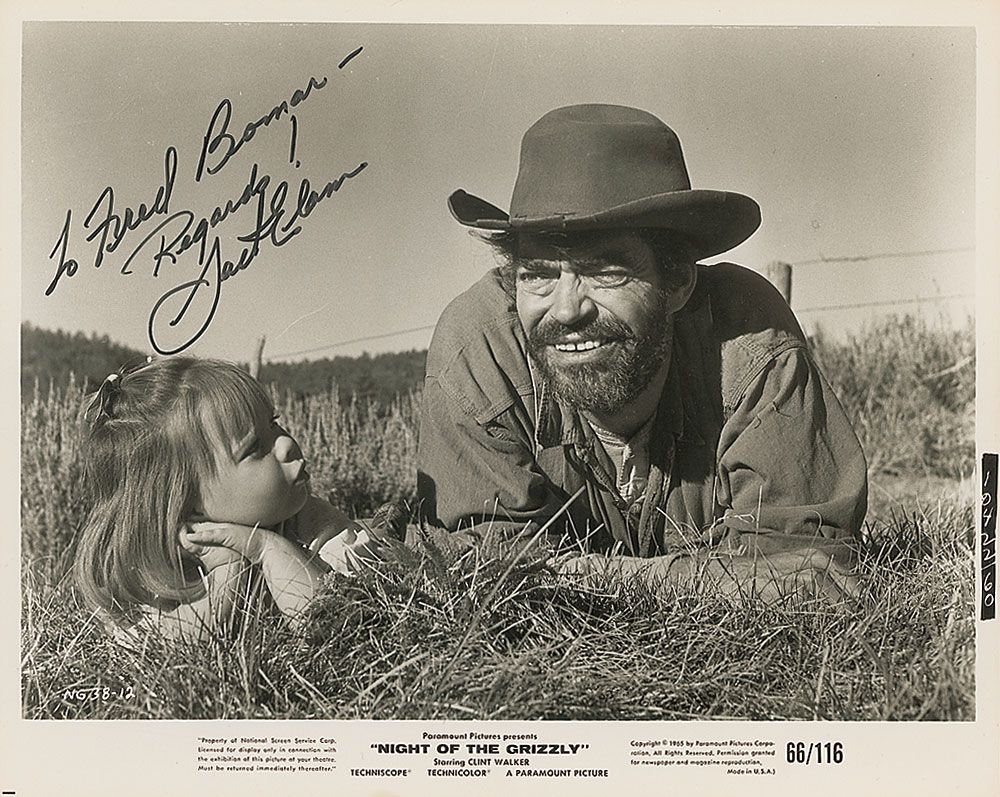 Glossy 10 x 8 Paramount publicity photo of Elam in Night of the Grizzly, signed and inscribed in black felt tip, “To Fred Bomar—Regards! Jack Elam.” In fine condition.