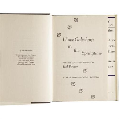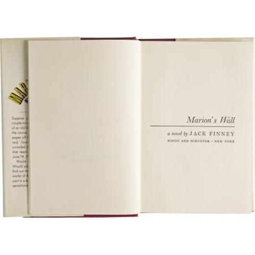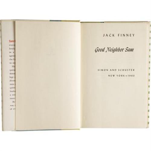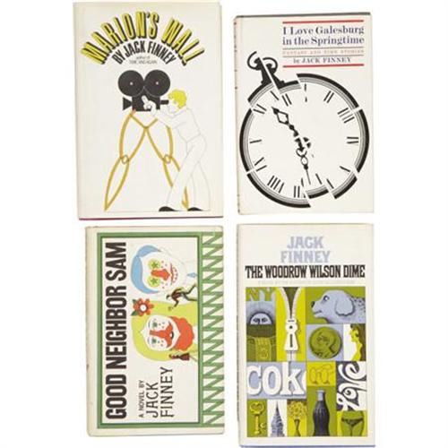 <B>Jack Finney</B></I>. <B>Four First Editions</B></I>, including: <B><I>Good Neighbor Sam</B></I></B></I>; <B><I>The Woodrow Wilson Dime</B></I></B></I>; <B><I>Marion's Wall</B></I></B></I>. New York: Simon and Schuster, 1963-1973. <B><I>I Love Galesburg in the Springtime</B></I></B></I>. London: Eyre and Spottiswoode [1965]. <BR>First hardcover editions. Four twelvemo volumes.<BR><I><BR>Good Neighbor Sam</B></I> has yellow cloth over gray boards with green titles. <I>The Woodrow Wilson Dime</B></I> is blue cloth with silver spine titles.<I> Marion's Wall </B></I>is red cloth with silver spine titles. <I>I Love Galesburg</B></I> is gray paper boards with silver spine titles. All in dust jackets. Overall, all are near fine to fine. <BR><BR>Wisconsin-born Jack Finney (1911-1995), a master of science-fiction and suspense, hit it big with his 1955 novel <I>The Body Snatchers</B></I>, which was adapted for the screen as <I>Invasion of the Body Snatchers</B></I> the following year. Some of his later works, including <I>Good Neighbor Sam</B></I>, were also made into popular films. <I>From the Robert and Diane Yaspan Collection.</B></I><BR><BR><b>Shipping:</b> Books & Catalogs (<a target="_blank" href="http://www.heritageauctions.com/common/shipping.php">view shipping information</a>)