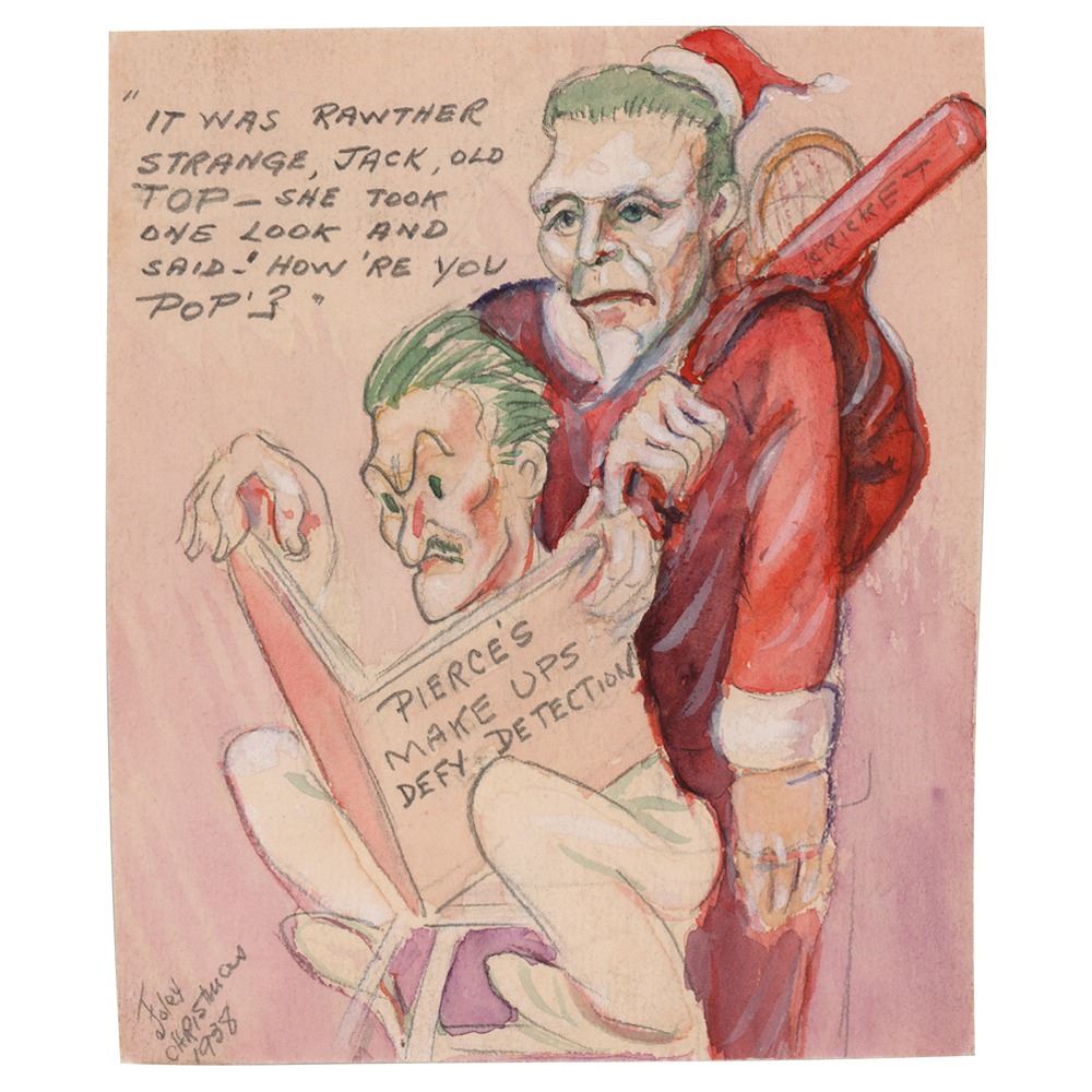 American sound effects artist (1891–1967) who was the developer of many sound effect techniques used in filmmaking. He is credited with developing a unique method for performing sound effects live and in synchrony with the picture during a film's post-production. Accordingly, individuals engaged in this trade are called ‘Foley artists.’ He worked on pictures such as Melody of Love, Show Boat, Dat Ol' Ribber, Dracula, Spartacus, and Operation Petticoat. Original artwork by sound effects master Jack Foley presented to renowned Hollywood make-up artist Jack Pierce, accomplished in graphite and watercolor on a 4.25 x 5.25 sheet, signed in the lower left corner in pencil, “Foley, Christmas, 1938.” The artwork depicts Pierce seated and reading his own book, “Pierce’s Make Up Defy Detection,” with Frankenstein’s monster dressed as Santa Claus standing behind him. A pencil caption to the upper left reads: “‘It was rawther strange, Jack, old top—she took one look and said, ‘How’re you Pop?’” In fine condition.