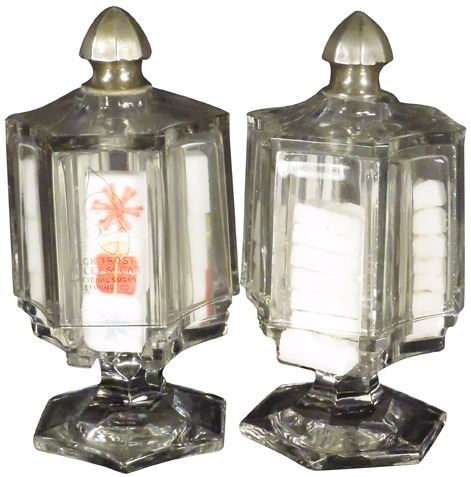 Jack Frost Tablet Sugar Dispensers. One has crack across front. 7 3/4 inches tall.