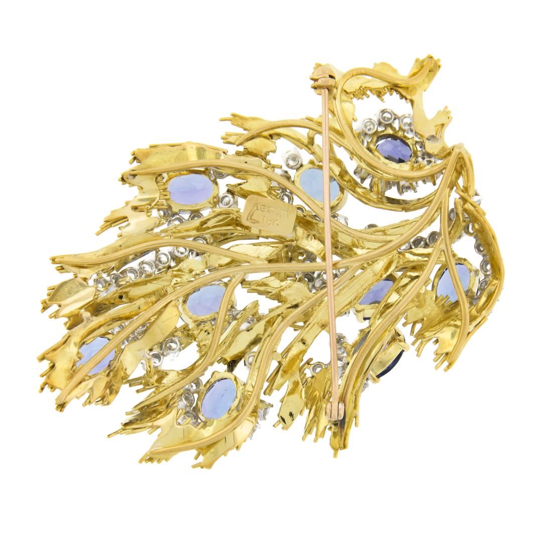A handmade solid 18k yellow & white gold brooch by Jack Gutschneider, with 71 round brilliant cut natural diamonds (G/H - VS2/SI1 ; 3.50ctw), and 9 oval cut natural tanzanites (6x8mm - 13ctw). Measures 62.8x50mm and weighs a total of 44.43 grams.