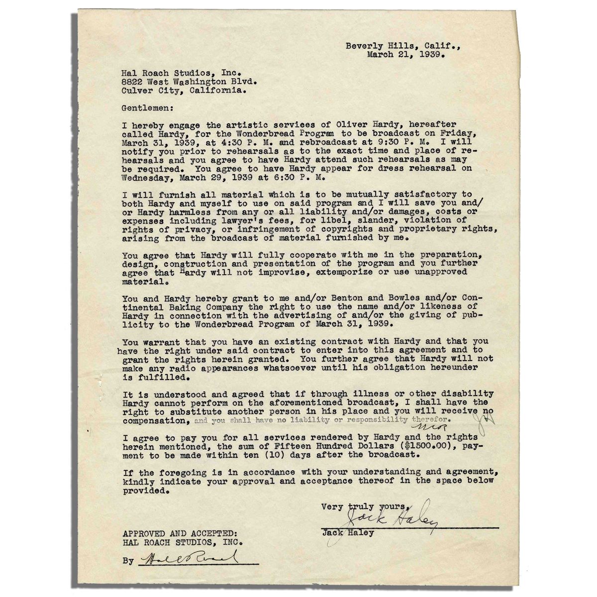 Set of documents related to the loaning of Oliver Hardy from Hal Roach Studios to Jack Haley for ''The Wonderbread Program.'' Contract signed by Jack Haley is dated 21 March 1939, shortly after he completed work on ''The Wizard of Oz.'' 8.5'' x 11'' contract is also signed by Hal Roach and initialed ''JH'' and ''HR''. Accompanied by a 8.5'' x 1.5'' correction slip also initialed ''JH'' and ''HR'', as well as three more 8.5'' x 11'' related documents, one additionally signed by Roach. On rice paper, all documents in very good to near fine condition.