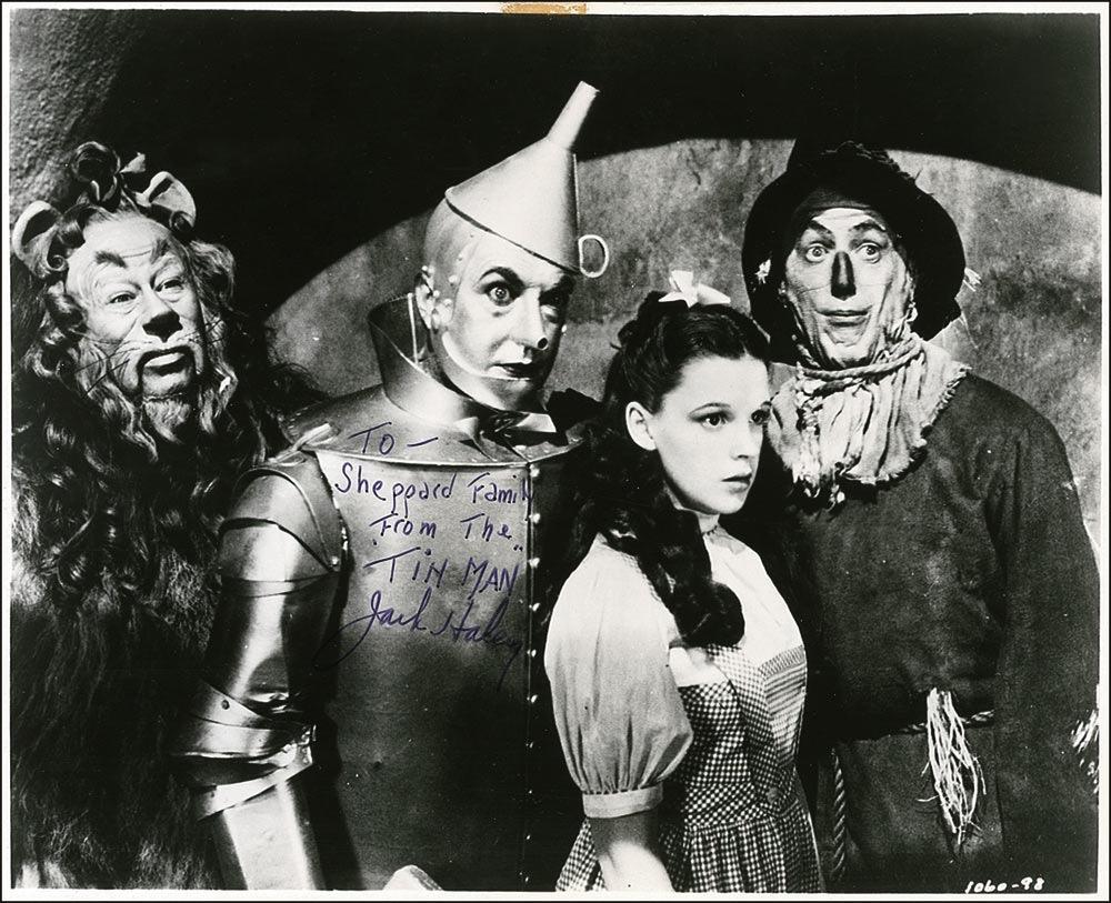 Jack Haley signed photo of himself as the Tin Man from ''The Wizard of Oz,'' inscribed in black felt-tip pen, ''To—Sheppard Family from the ‘Tin Man’ Jack Haley.'' Nice black and white glossy photo pictures himself with Dorothy, the Cowardly Lion and the Scarecrow. 9.5'' x 7.75'' photo has lightly trimmed edges, some scattered light surface marks, and old tape remnant to top edge; overall very good condition.