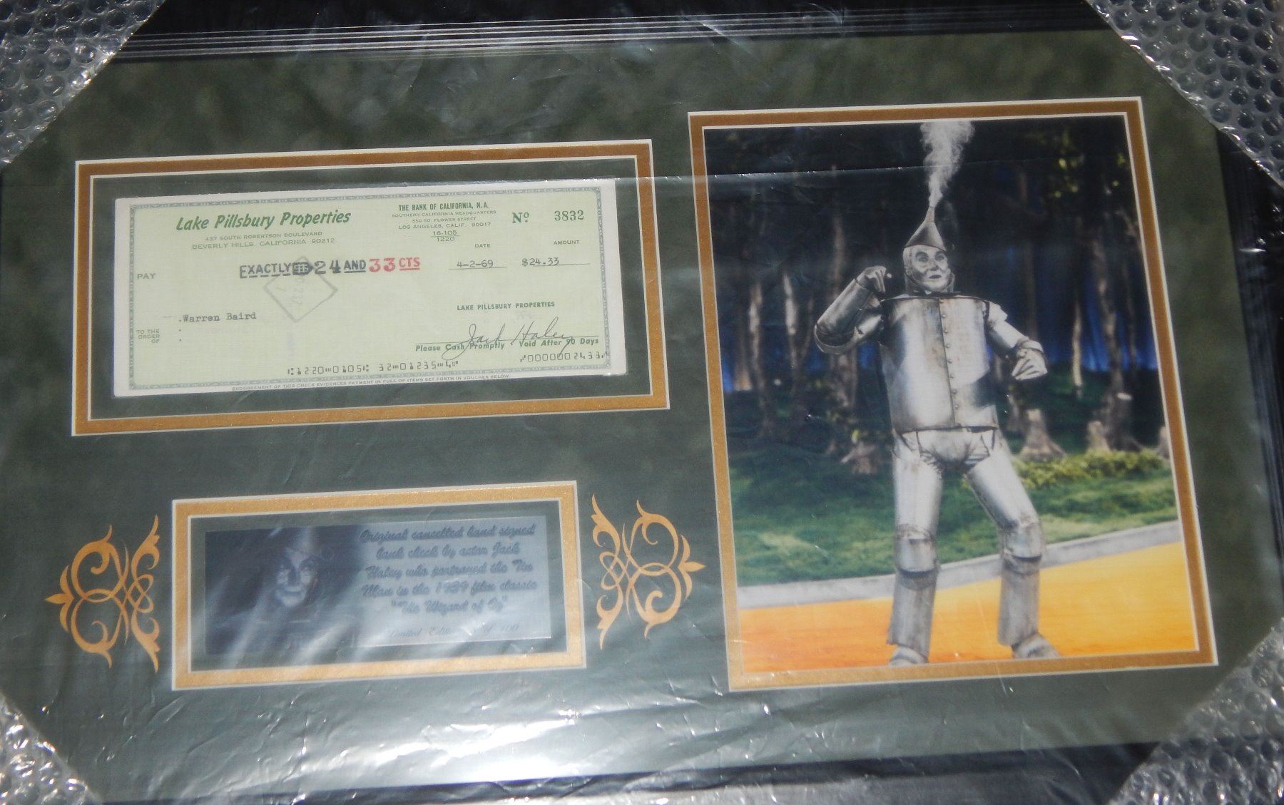 Limited edition framed original bank check signed by The Wizard of Oz Tin Man Jack Haley. The check is on his corporate Lake Pillsbury Properties account. The checks were obtained from the estate of Jack Haley, Jr. in 2010. All items come with a certificate of authenticity good for the life of the piece.