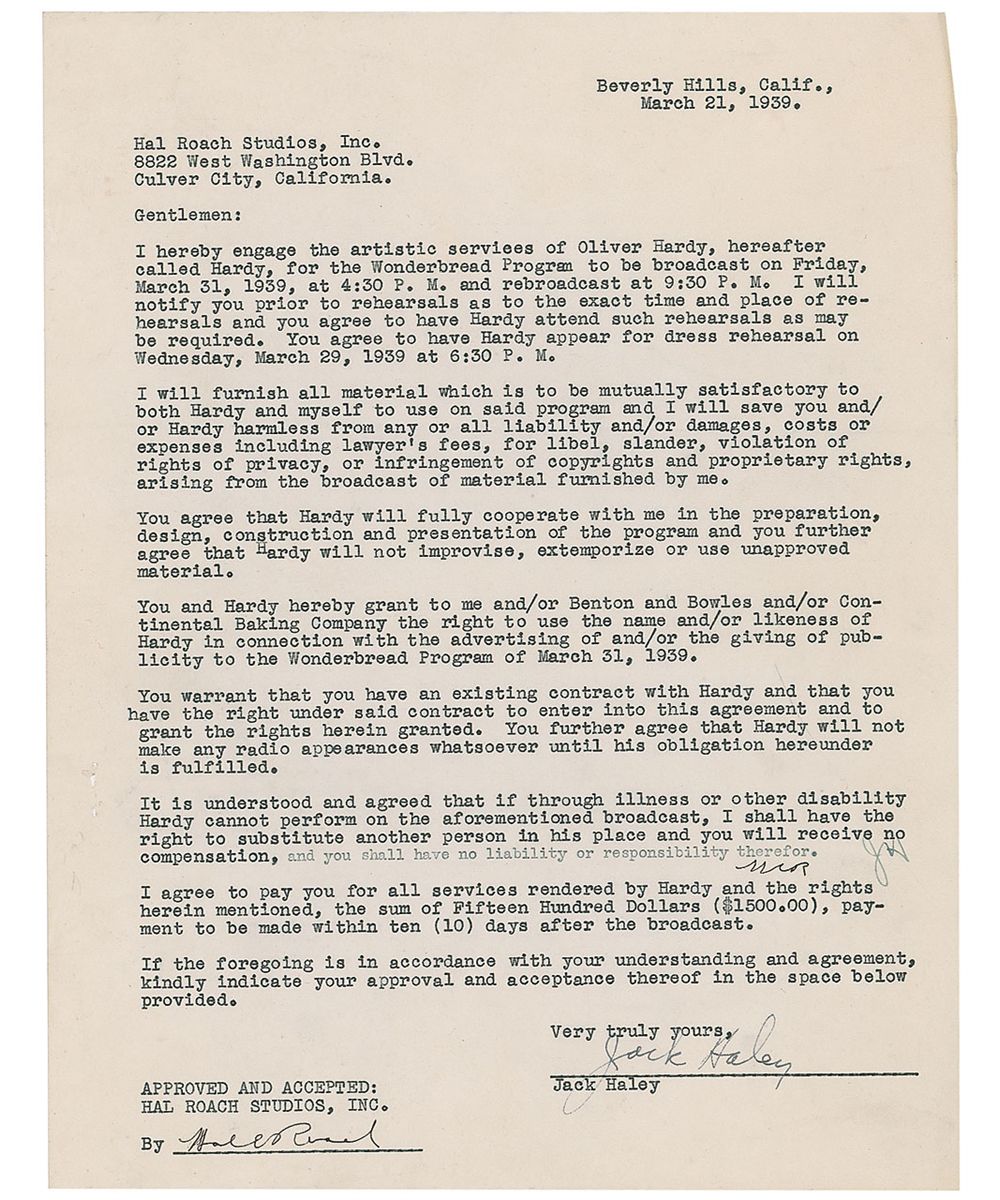 DS, one page, 8.5 x 11, March 21, 1939. Agreement between Haley and Hal Roach Studios in which Haley retains “the artistic services of Oliver Hardy…for the Wonderbread Program to be broadcast on Friday, March 31, 1939,” in exchange for a payment of $1500. The contract further stipulates that “Hardy will not improvise, extemporize, or use unapproved material.” Signed at the conclusion by Haley, “Jack Haley,” and Roach, “Hal E. Roach.” A change to the main text has been initialed by both, as well as an accompanying rider (now detached). In fine condition. Accompanied by two related letters between studios.