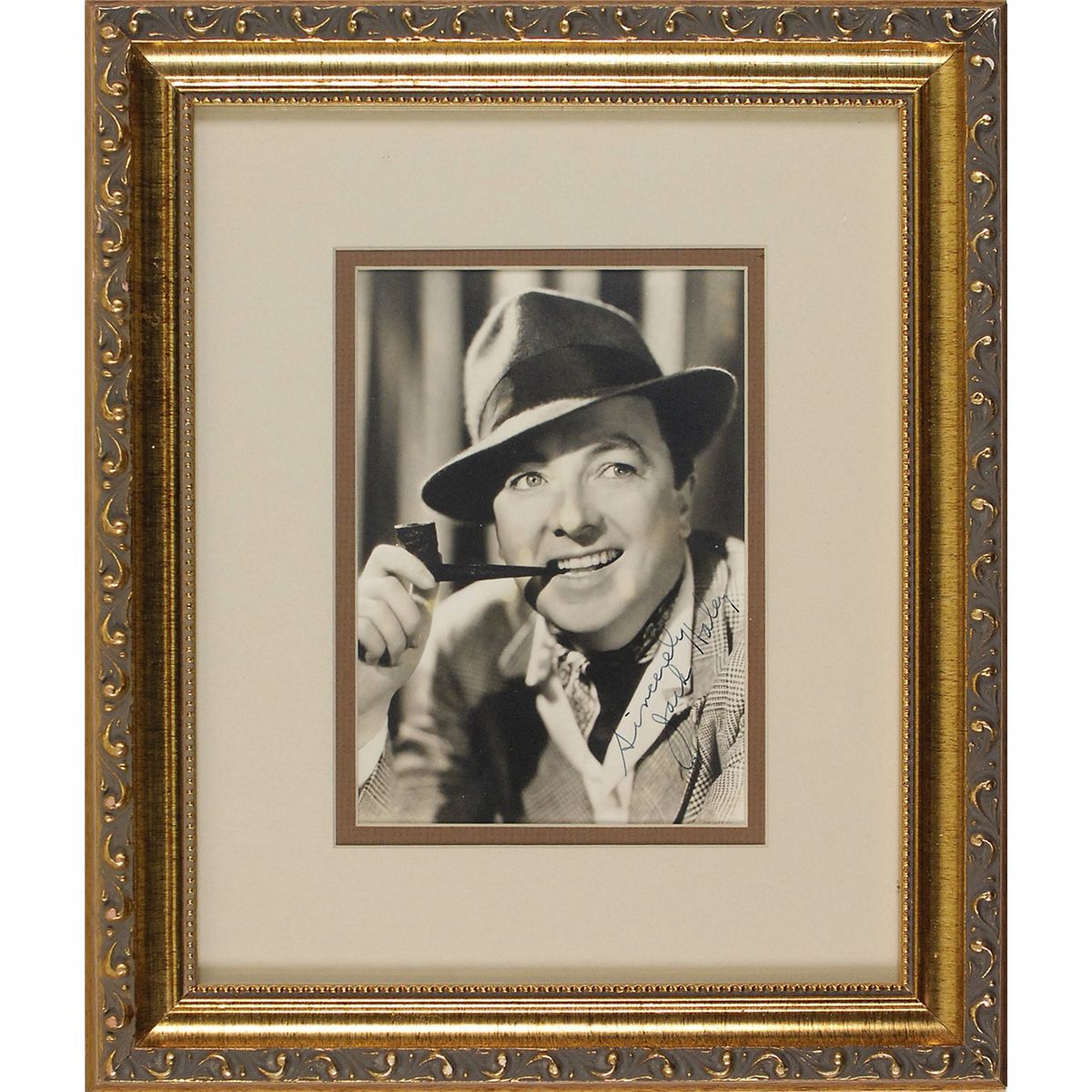 Vintage matte-finish 4.5 x 6.5 photo of Haley enjoying a pipe, signed in fountain pen, “Sincerely, Jack Haley.” Double-matted and framed to an overall size of 10.5 x 12.5. In fine condition, with a hint of mild silvering to a few of the darker areas.