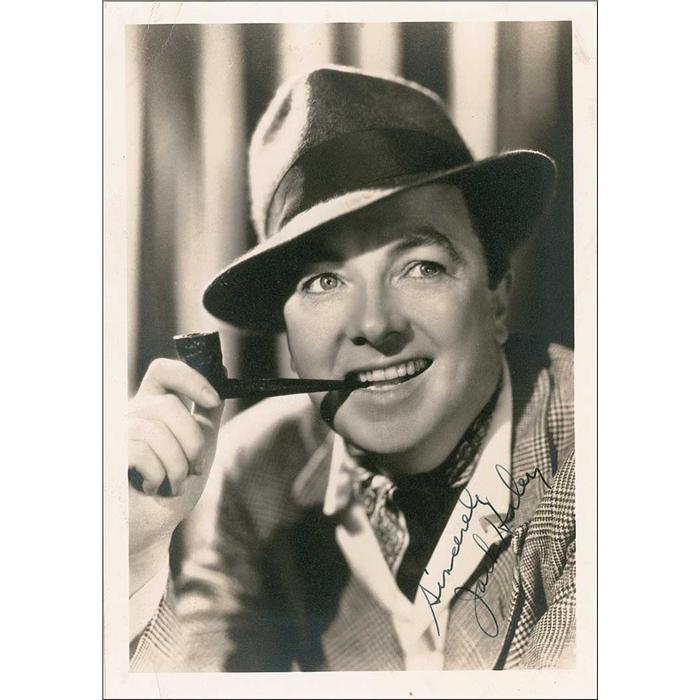 Vintage matte-finish 5 x 7 photo of Haley enjoying a pipe, signed in fountain pen, “Sincerely, Jack Haley.” In fine condition, with creasing to left corners, and a bit of scattered light silvering. Pre-certified PSA/DNA and RRAuction COA.