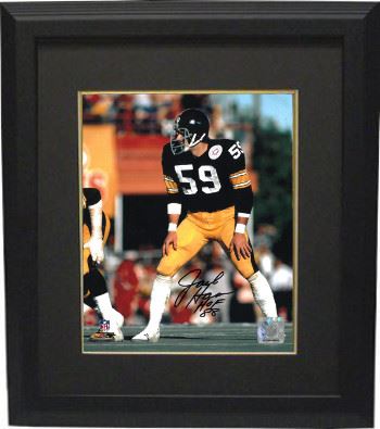 Jack Ham was the Pittsburgh Steelers second-round draft pick in the 1971 NFL Draft out of Penn State, where he was an All-American. He won the starting left linebacker job as a rookie. He was First-team All-Pro six years and was named to eight straight Pro Bowls. Ham was a member of 4 Super Bowl winning teams during his 12 year career, all of it spent with the Steelers. Jack Ham has hand signed this Pittsburgh Steelers 8x10 Photo with HOF 88 inscription. Certificate of Authenticity from Athlon Sports Collectibles. Custom Black Mat and Premium Black Color Framed as shown.