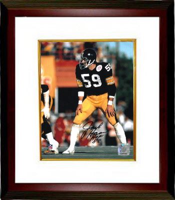 Jack Ham was the Pittsburgh Steelers second-round draft pick in the 1971 NFL Draft out of Penn State, where he was an All-American. He won the starting left linebacker job as a rookie. He was First-team All-Pro six years and was named to eight straight Pro Bowls. Ham was a member of 4 Super Bowl winning teams during his 12 year career, all of it spent with the Steelers. Jack Ham has hand signed this Pittsburgh Steelers 8x10 Photo with HOF 88 inscription. Certificate of Authenticity from Athlon Sports Collectibles. Custom White Mat and Premium Mahogany Color Framed as shown.