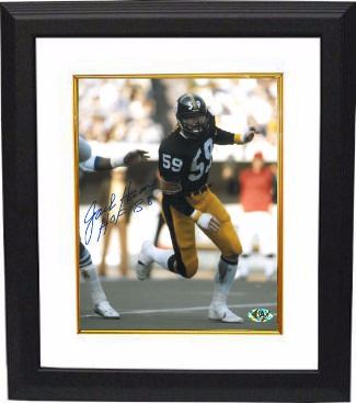 Jack Ham was the Pittsburgh Steelers second-round draft pick in the 1971 NFL Draft out of Penn State, where he was an All-American. He won the starting left linebacker job as a rookie. He was First-team All-Pro six years and was named to eight straight Pro Bowls. Ham was a member of 4 Super Bowl winning teams during his 12 year career, all of it spent with the Steelers. Jack Ham has hand signed this Pittsburgh Steelers 8x10 Photo with HOF 88 inscription. MAB Hologram and Certificate of Authenticity from Athlon Sports. Custom White Mat and Premium Black Frame as shown.