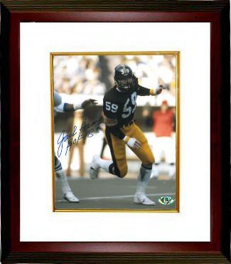 Jack Ham was the Pittsburgh Steelers second-round draft pick in the 1971 NFL Draft out of Penn State, where he was an All-American. He won the starting left linebacker job as a rookie. He was First-team All-Pro six years and was named to eight straight Pro Bowls. Ham was a member of 4 Super Bowl winning teams during his 12 year career, all of it spent with the Steelers. Jack Ham has hand signed this Pittsburgh Steelers 8x10 Photo with HOF 88 inscription. MAB Hologram and Certificate of Authenticity from Athlon Sports. Custom White Mat and Premium Mahogany Frame as shown.
